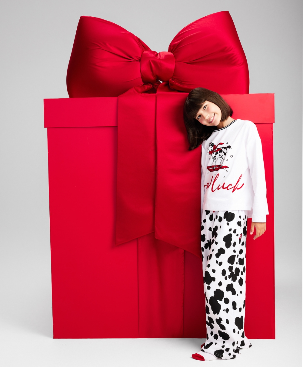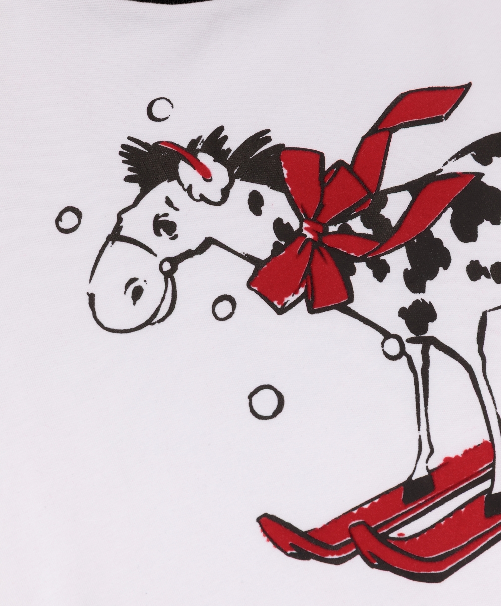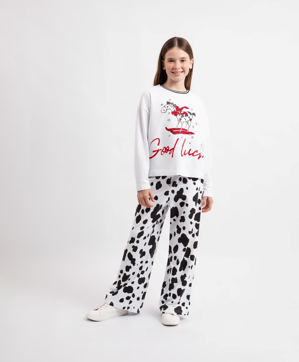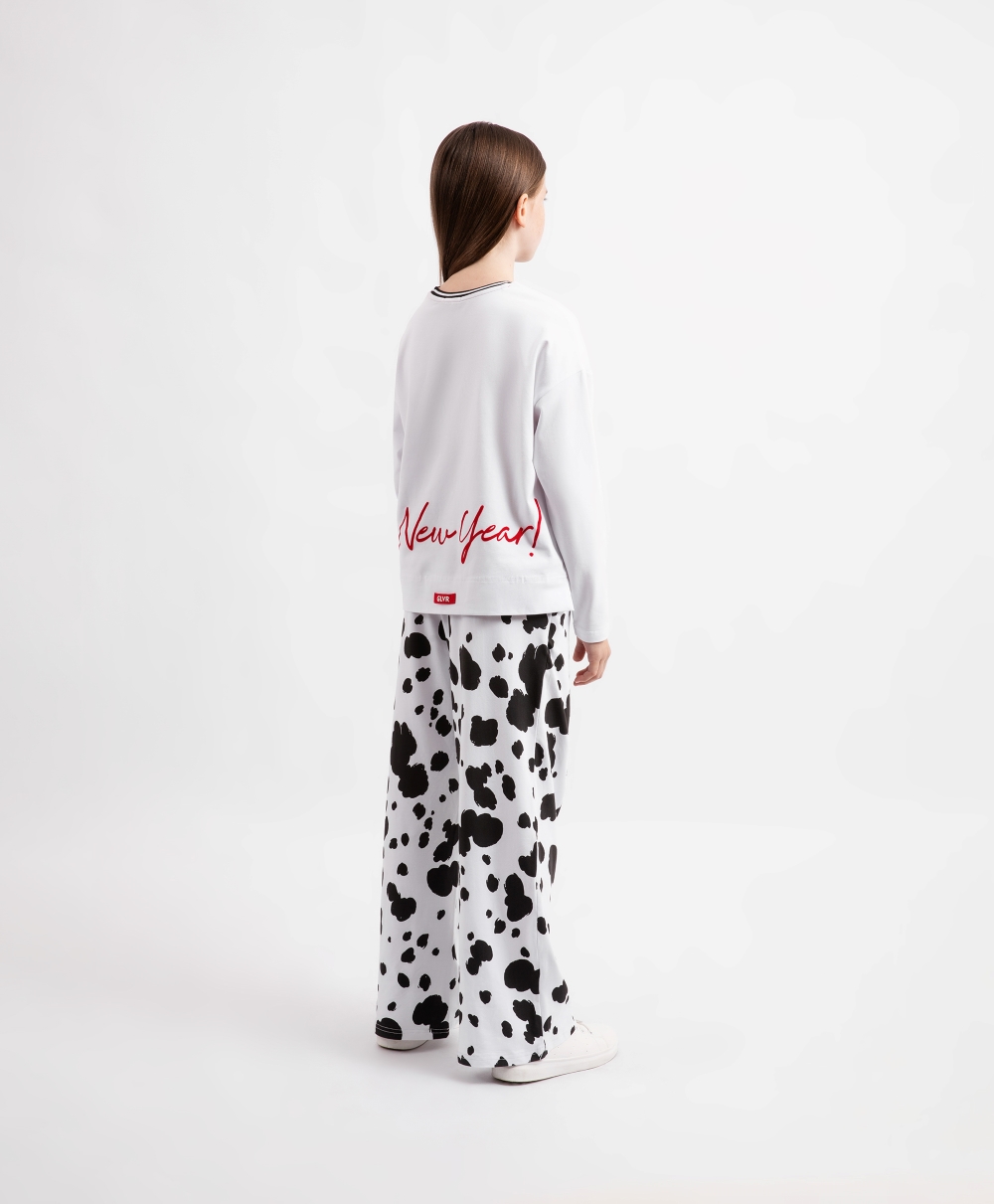 Пижама с новогодним принтом идеально подойдет для создания уютной домашней атмосферы в преддверии праздника или после него!  Белый лонгслив с оригинальным тематическим изображением и свободные трикотажные брюки с поясом на резинке, имеющие контрастный черно-белый рисунок, очень пластичны, комфортны в эксплуатации, приятны тактильно.