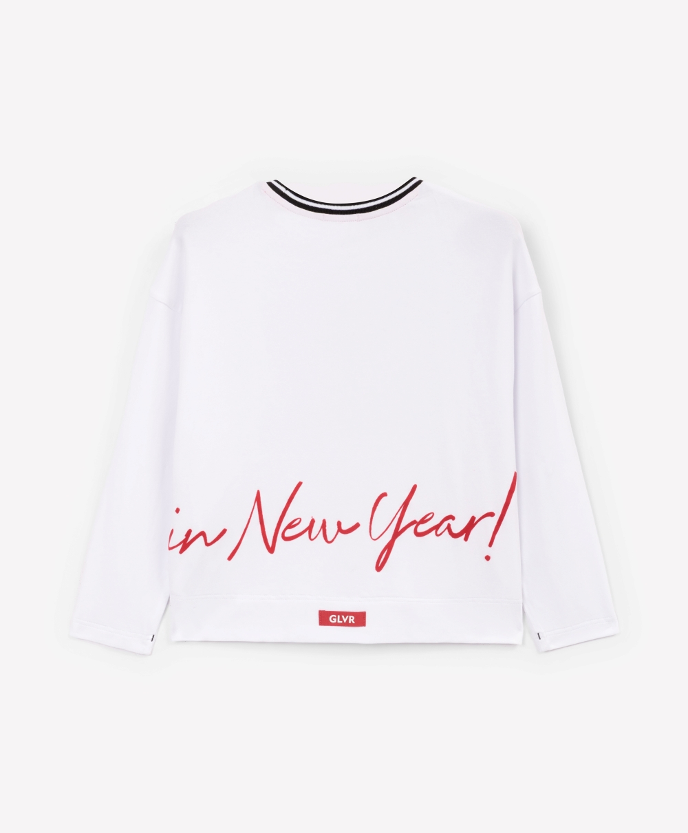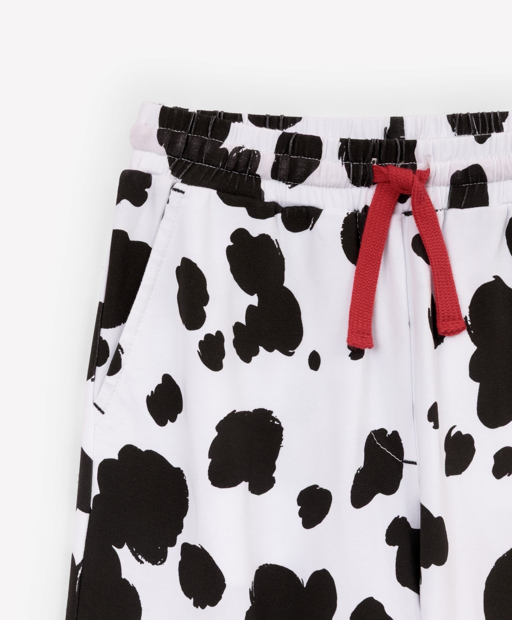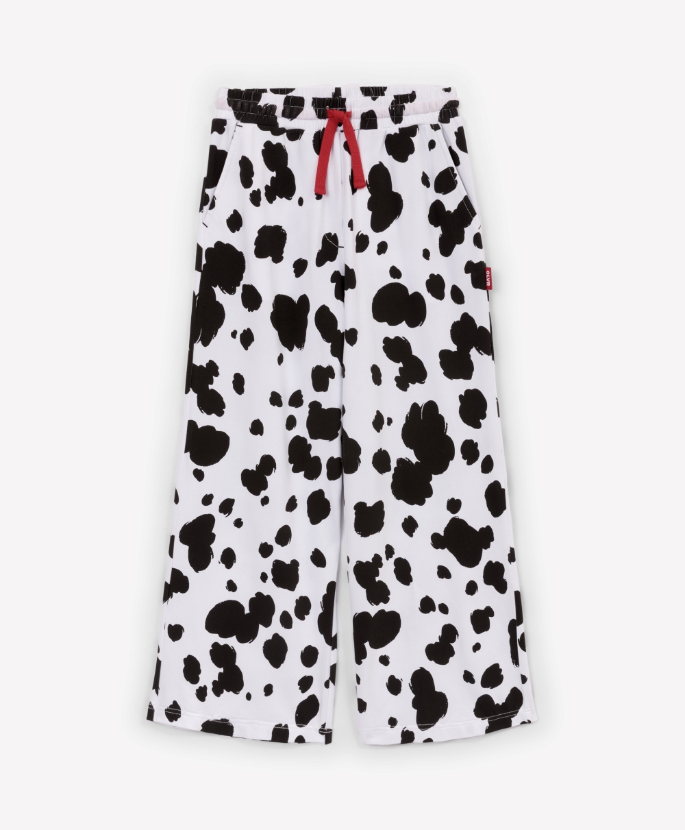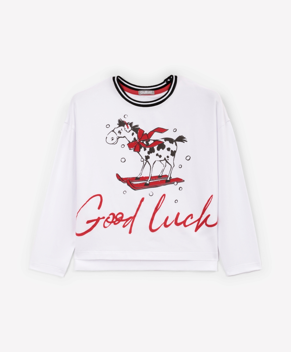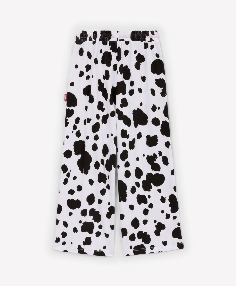Пижама с новогодним принтом идеально подойдет для создания уютной домашней атмосферы в преддверии праздника или после него!  Белый лонгслив с оригинальным тематическим изображением и свободные трикотажные брюки с поясом на резинке, имеющие контрастный черно-белый рисунок, очень пластичны, комфортны в эксплуатации, приятны тактильно.