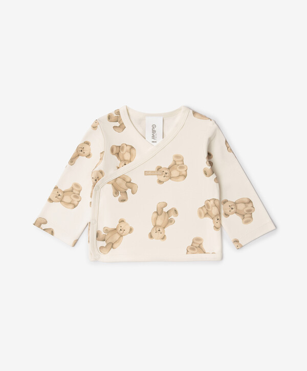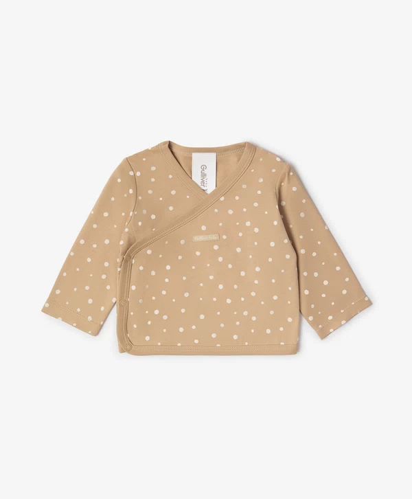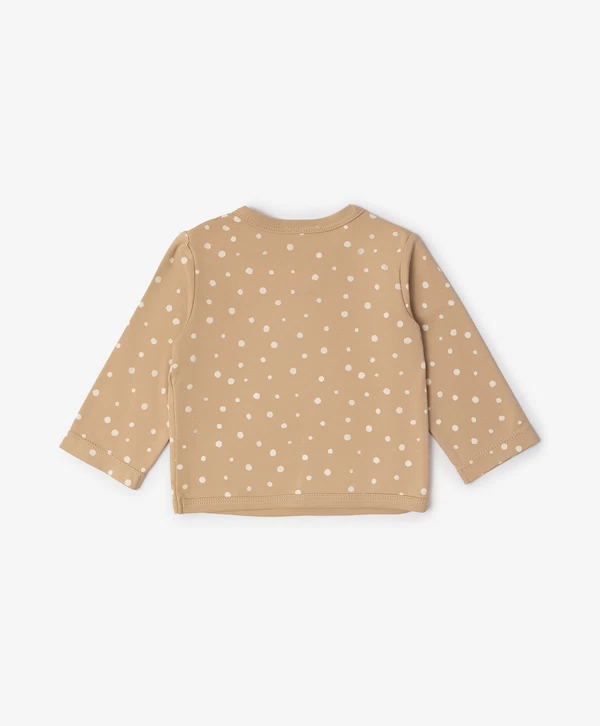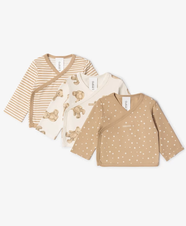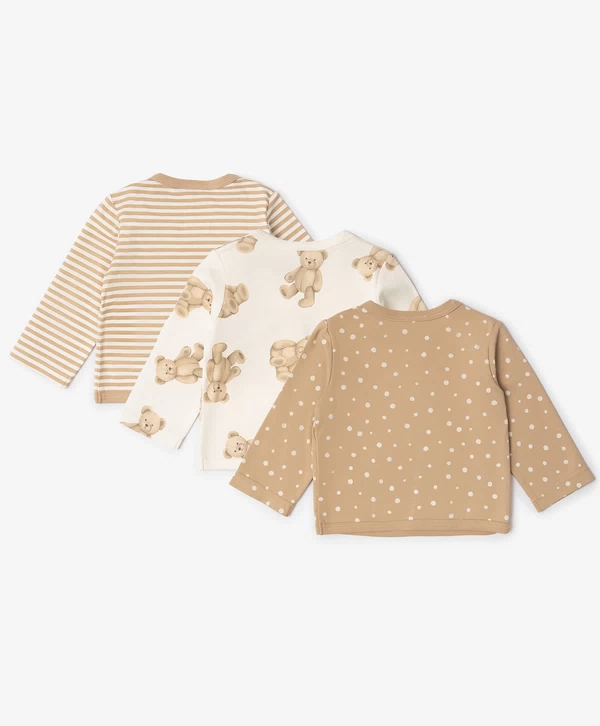 Одна из самых нужных вещей для новорождённого — трикотажная кофточка с длинным рукавом. Комплект из 3-х кофточек с оригинальными принтами в бежевых тонах внесёт разнообразие в повседневные образы малыша. Хлопковый пластичный трикотаж мягко касается кожи ребёнка, обеспечивая уют и комфорт. Кофточки застёгиваются на кнопки. В оформлении изделий использована фирменная жаккардовая нашивка.