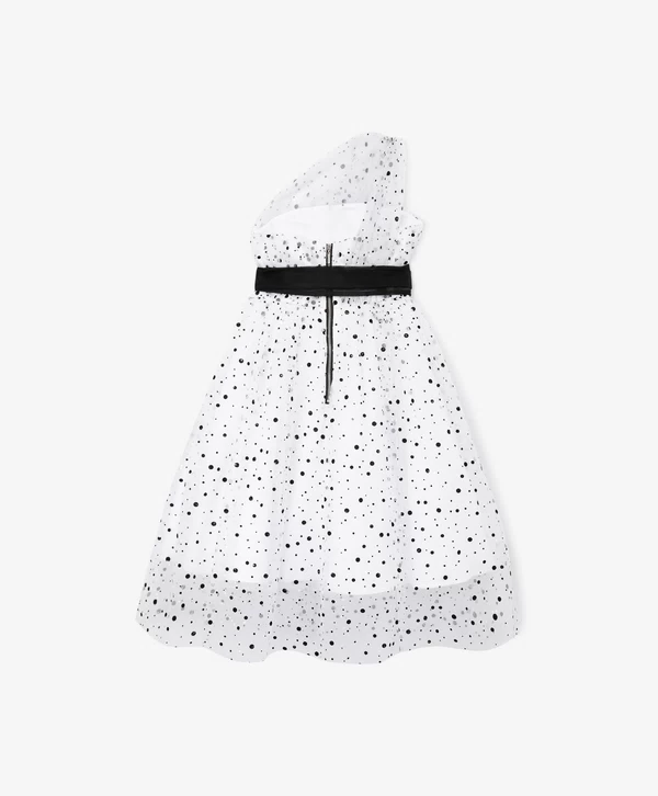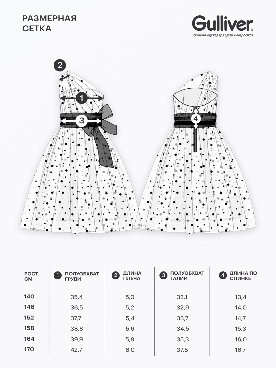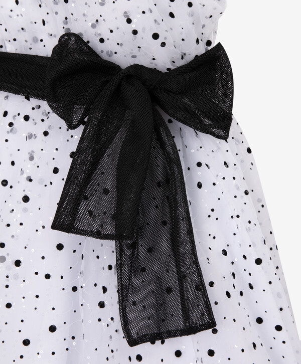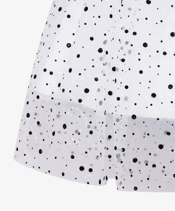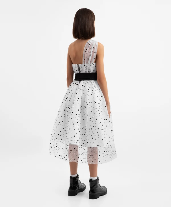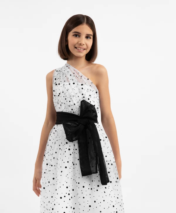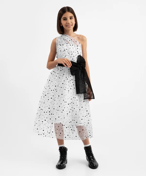 Элегантное приталенное платье без рукавов с асимметричным верхом покорит девочку своей интересной фактурой! Изделие выполнено из двух слоёв: формоустойчивого матового текстиля и воздушной пышной сетки. Сетка оформлена мелкими сверкающими пайетками и велюровым принтом в горох. Декор выглядит очень эффектно, оригинально, стильно. Платье дополнено чёрным поясом из сетки, который подчеркнёт талию и создаст приятный контраст.