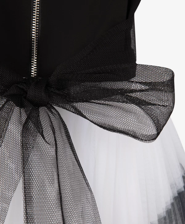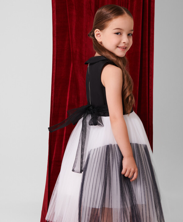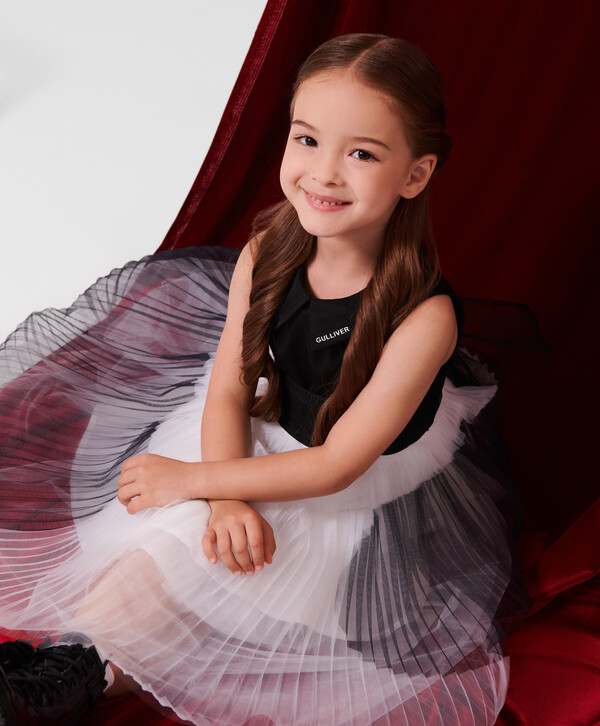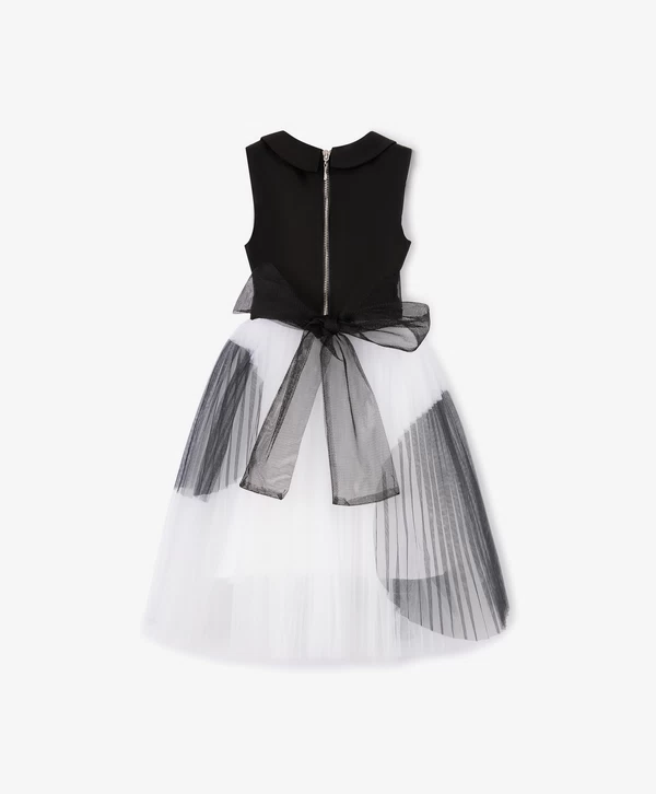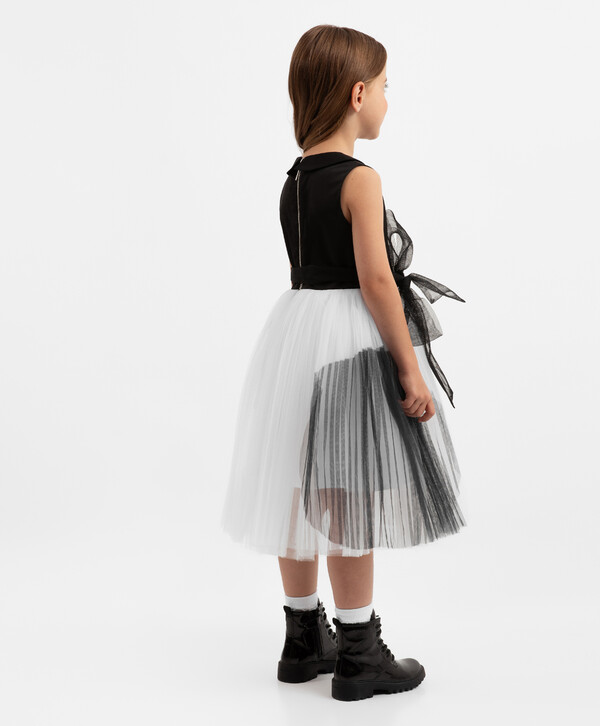 Сочетание чёрного и белого — классика, актуальная во все времена! Чёрно-белое платье идеально подойдёт как для крупных торжеств, так и для небольших семейных праздников. Крупный монораппортный рисунок в горох делает платье острым, выразительным, экстравагантным. Верх изделия выполнен из матового текстиля, низ — из пышной гофрированной сетки. Дышащая хлопковая подкладка обеспечивает приятные тактильные ощущения. Платье имеет отложной воротник с небольшими шрифтовыми элементами. Эта деталь придаёт изделию строгость и деликатность, подчеркивает элегантность дизайнерского решения. Платье дополнено чёрным поясом из сетки, с помощью которого можно красиво подчеркнуть талию.