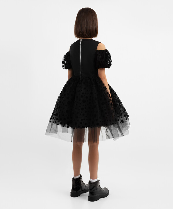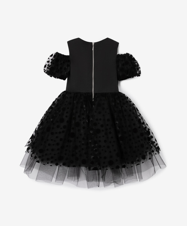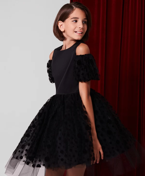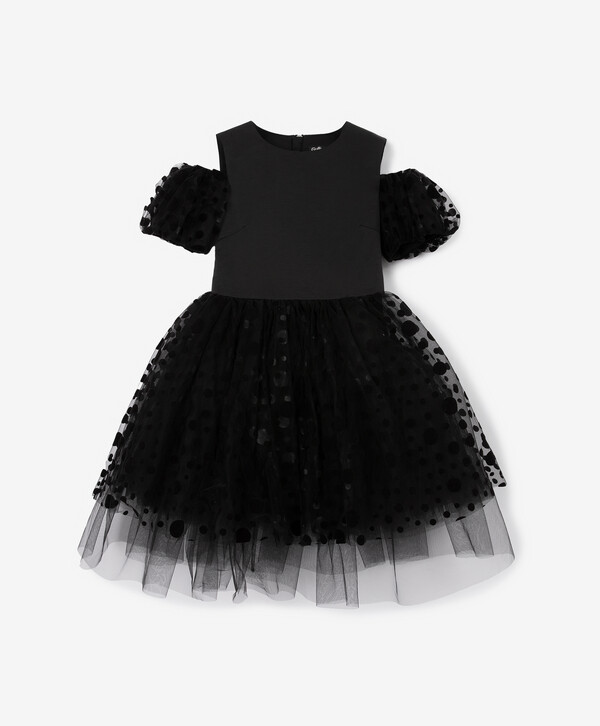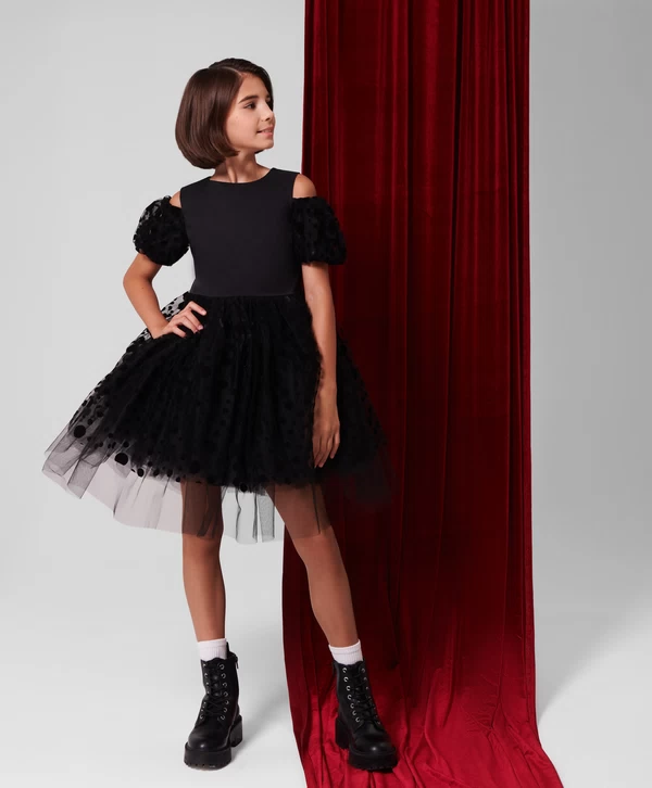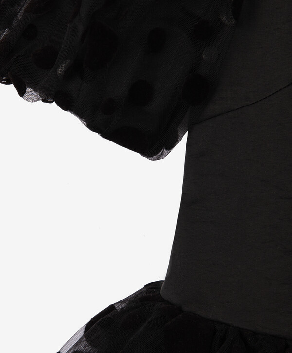 Для тех, кто хочет почувствовать себя главной героиней романтического фильма — чёрное приталенное платье из двух слоёв: основного материала и объёмной фактурной сетки с велюровым принтом в горох. Верх изделия выполнен из дышащего текстиля на основе хлопка, что позволяет носить платье на протяжении всего дня и не чувствовать дискомфорта. Спущенные объёмные рукава придают образу лёгкость и элегантность.
