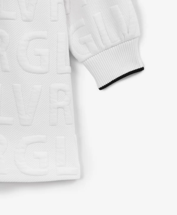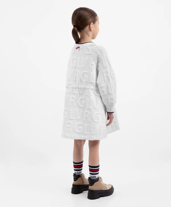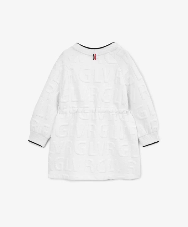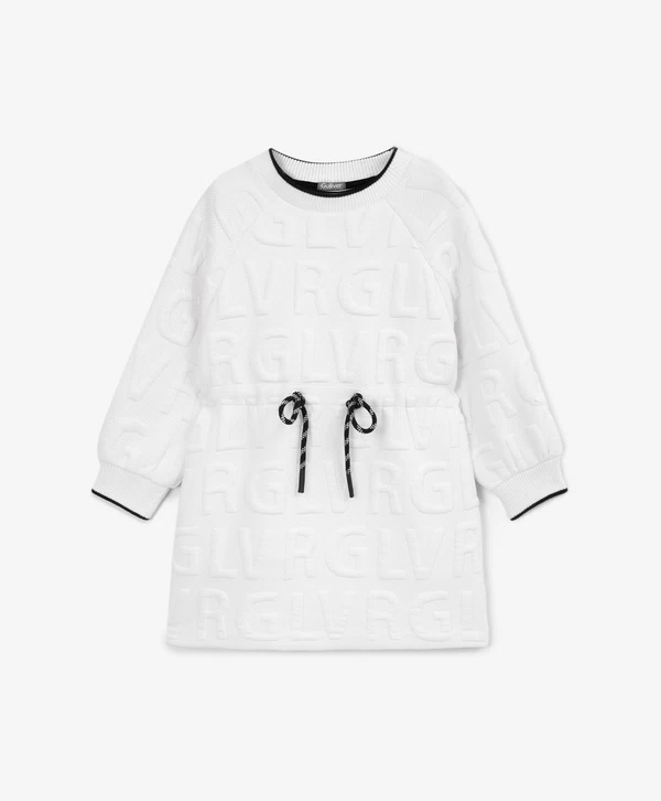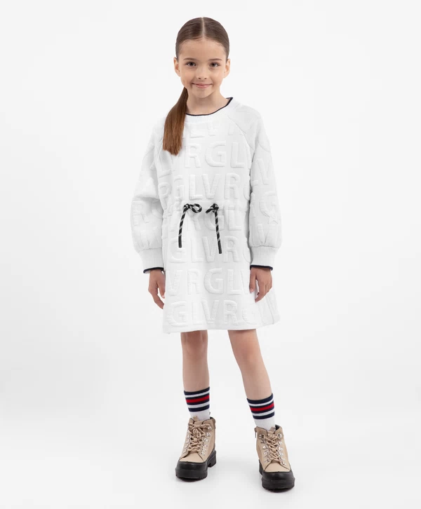 Трапециевидное или приталенное платье? В этой универсальной белой модели девочке не придётся выбирать — контрастные корды на талии можно затянуть или расслабить, регулируя силуэт платья по желанию. Изделие выполнено из мягкого, эластичного и приятного на ощупь трикотажного полотна "капитоний", обладающего прекрасной формоустойчивостью. Крупные объемные шрифтовые элементы по всей поверхности платья наделяют его интересной и оригинальной фактурой. На рукаве платья расположена силиконовая нашивка. Рибовые манжеты и горловина оформлены контрастными полосками.