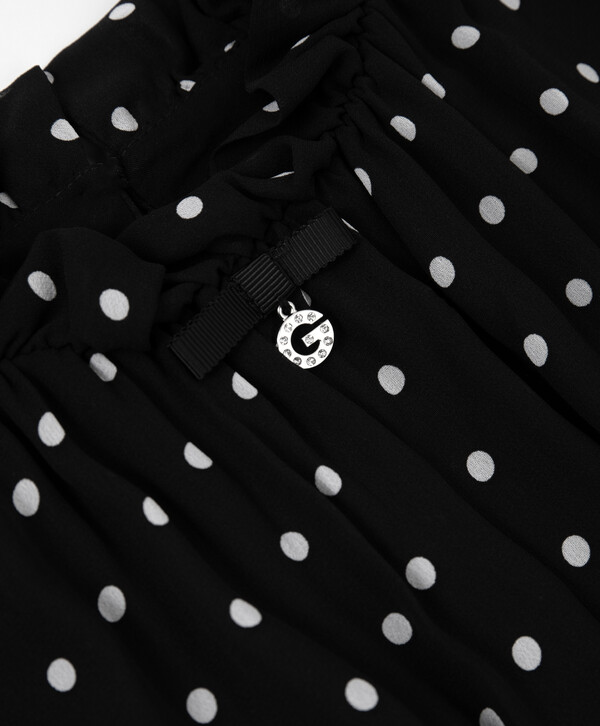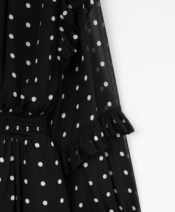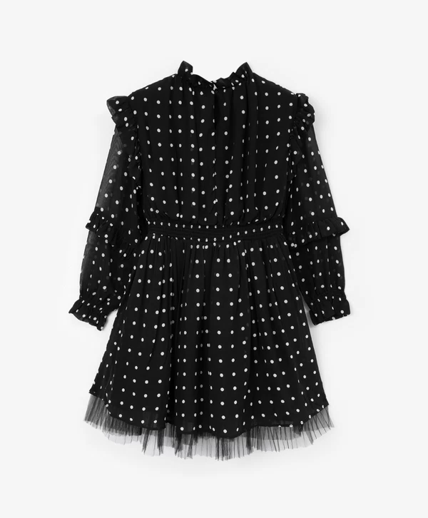 Сочетание воздушного материала, изысканного силуэта и классического рисунка в этом черном платье в горох сделали его бестселлером осеннего сезона! Модель приталенного силуэта с эластичным поясом выглядит очень нежно и женственно. Платье выполнено из летящей вискозы. Струящийся материал приятен на ощупь, он хорошо драпируется, приятен тактильно, прост в уходе и эксплуатации. Платье имеет полупрозрачные рукава, дополненные романтичными рюшами. Подкладка юбки усилена слоем сетки, которая делает её более объёмной. На воротнике расположен репсовый бантик с навесной деталью со стразами. Платье застёгивается на пуговицу на спинке.