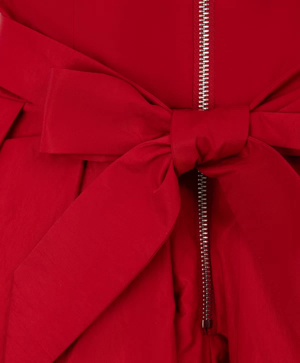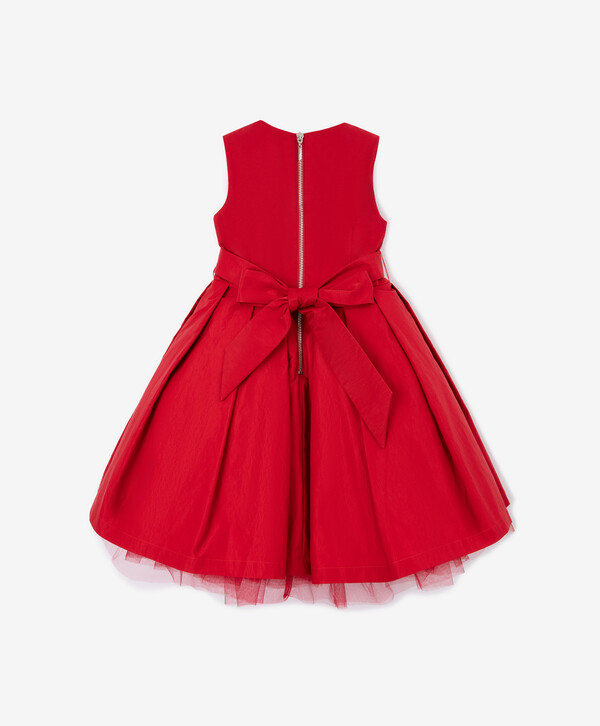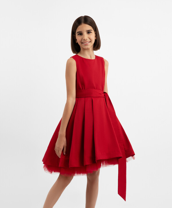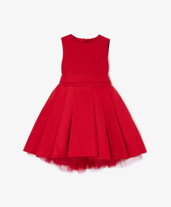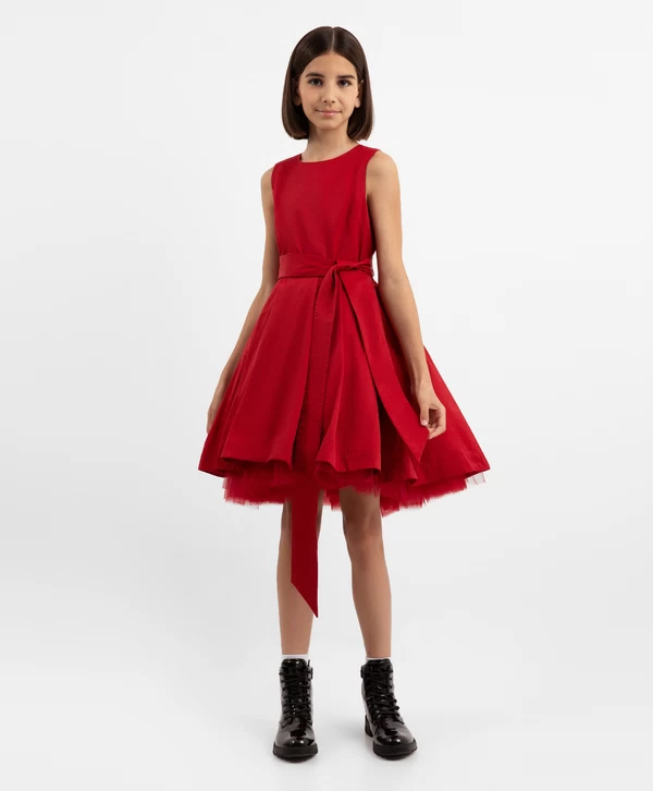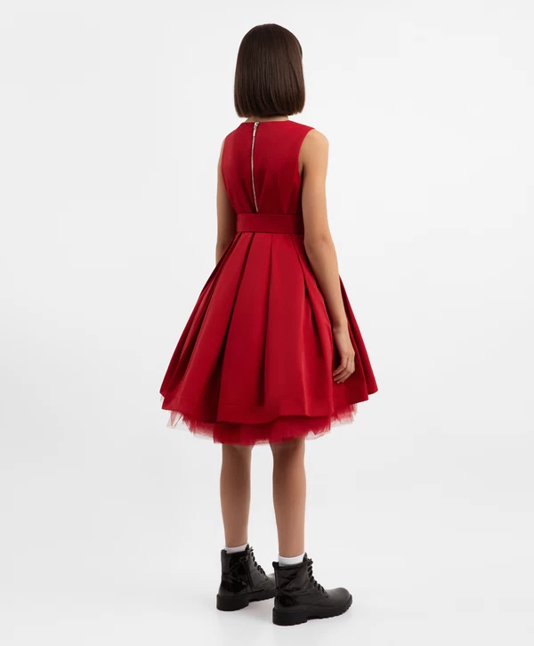 Это любовь с первого взгляда! Бордовое платье без рукавов с укороченной линией переда станет идеальным праздничным вариантом. Изделие выполнено из плотного шуршащего текстиля с благородным матовым блеском. Юбка имеет хлопковую подкладку с несколькими слоями сетки, благодаря которой она выглядит объёмной и пышной. Платье застегивается на молнию, расположенную на спинке. Изделие дополнено поясом.