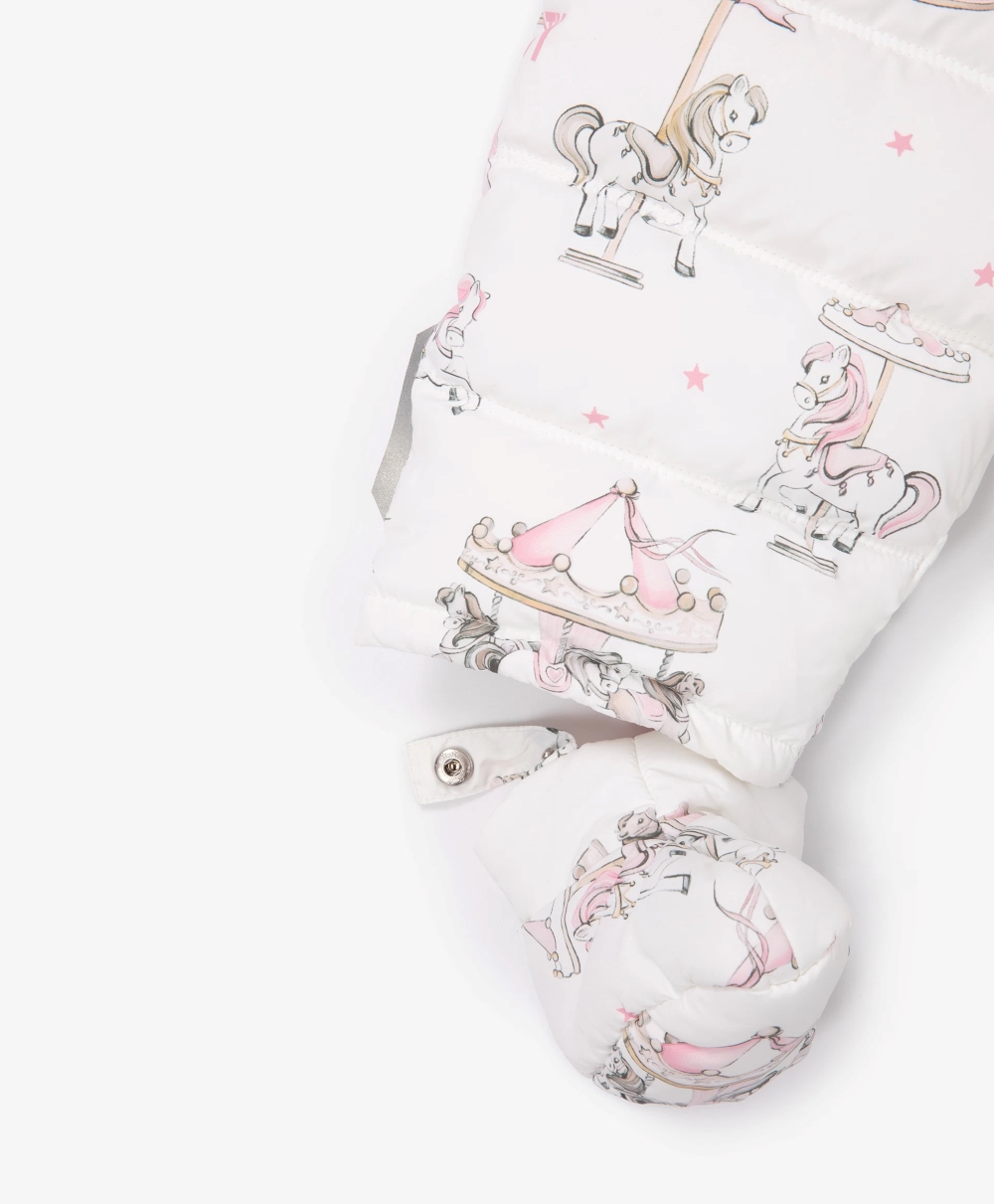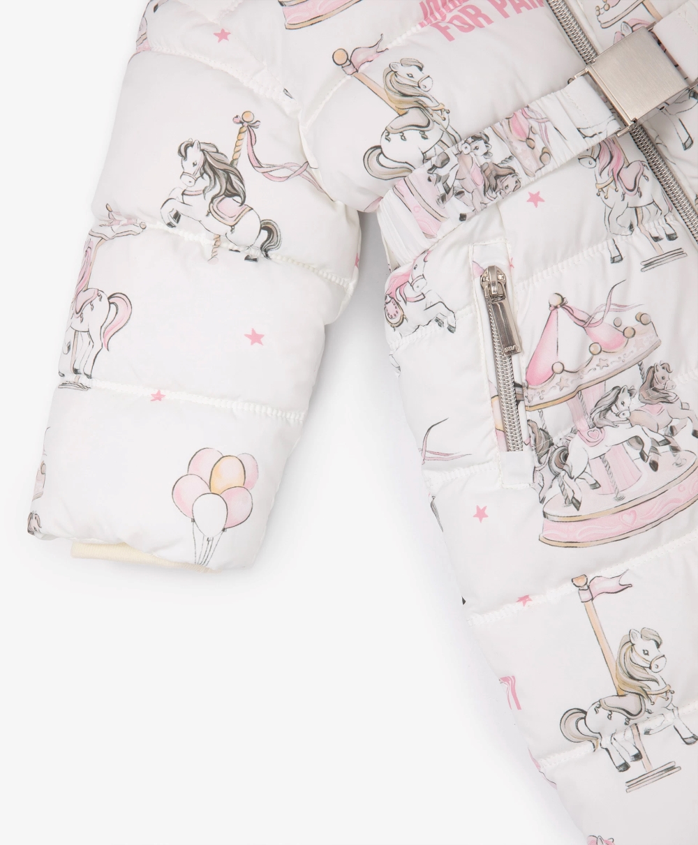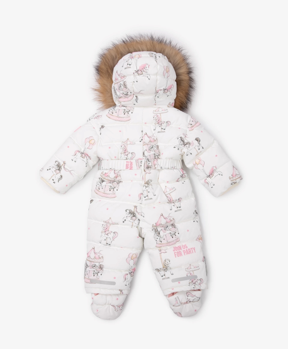Зимний комбинезон с очаровательным девичьим рисунком, на искусственном пуху, выполненный из гладкой влагостойкой плащовки на хлопковой трикотажной подкладке, создаст мягкий, нежный, зефирный образ малышки. Отстегивающаяся опушка капюшона из натурального меха енота делает комбинезон завершенным. Специальные утяжки, позволяющие плотно зафиксировать капюшон на голове ребенка, защищают девочку от холодного ветра. Комбинезон застегивается на молнию, имеет съемный пояс с пряжкой, трикотажные манжеты, удобные карманы. Для детей роста 74, 80, которые зимой, как правило, спят в коляске, комбинезон комплектуется утепленными пинетками, пристегивающимися на кнопки. Для детей роста 86, 92, делающих первые шаги, комбинезон имеет снегозащитные манжеты. В оформлении модели используются светоотражающие элементы, способствующие безопасности ребёнка в тёмное время суток.