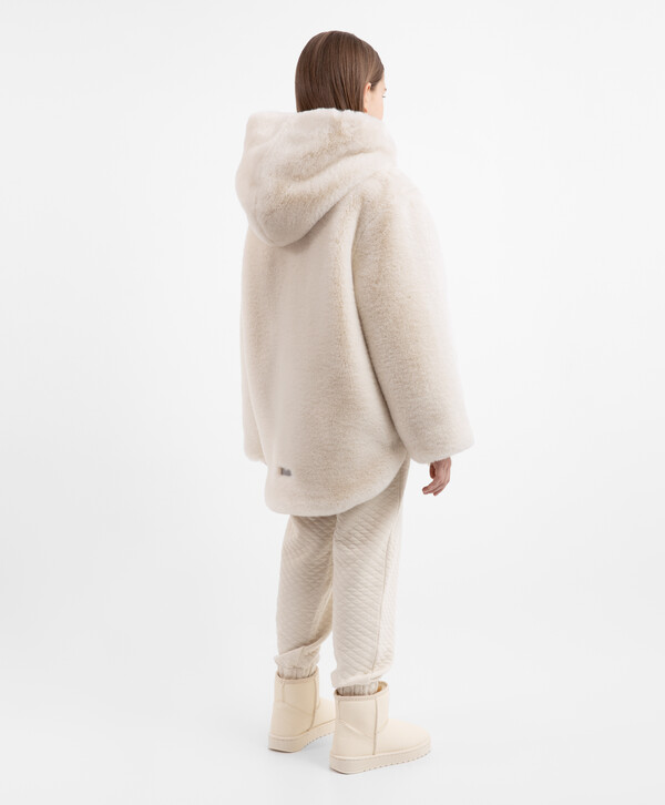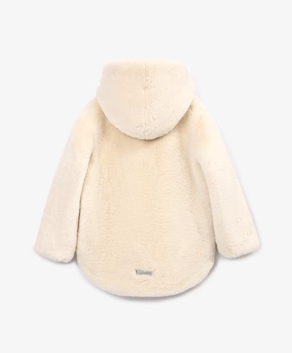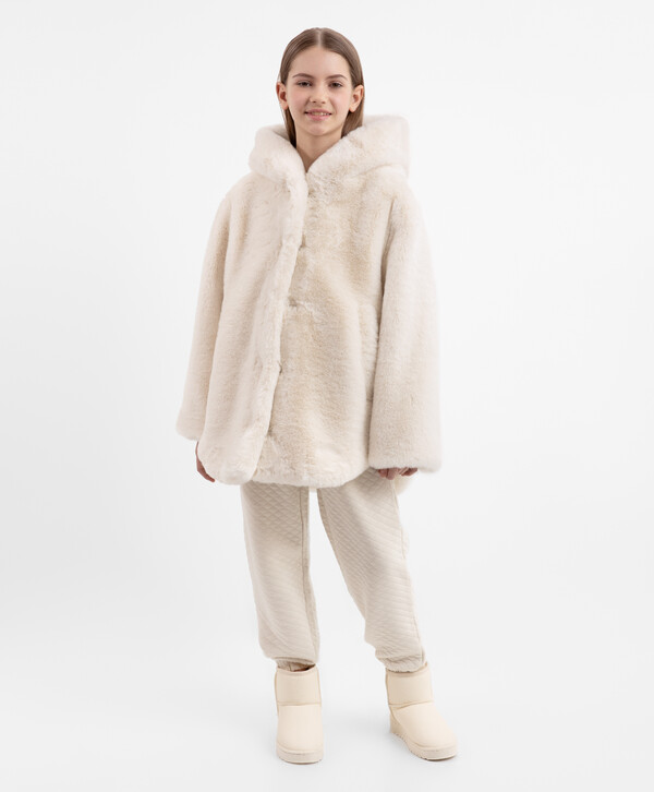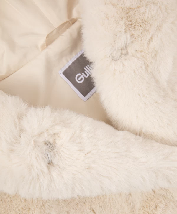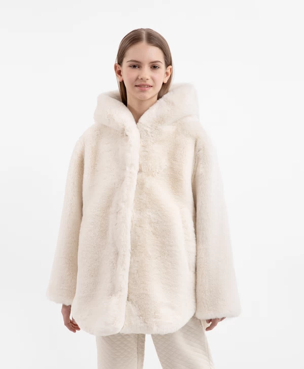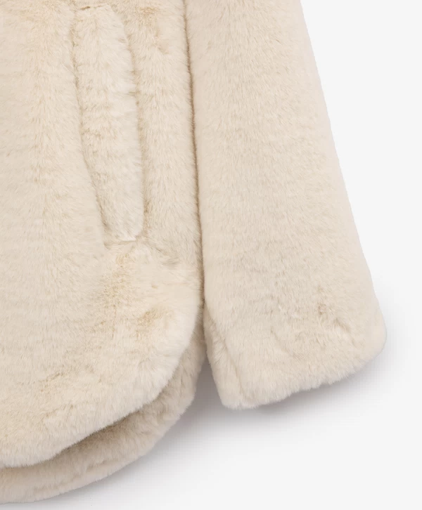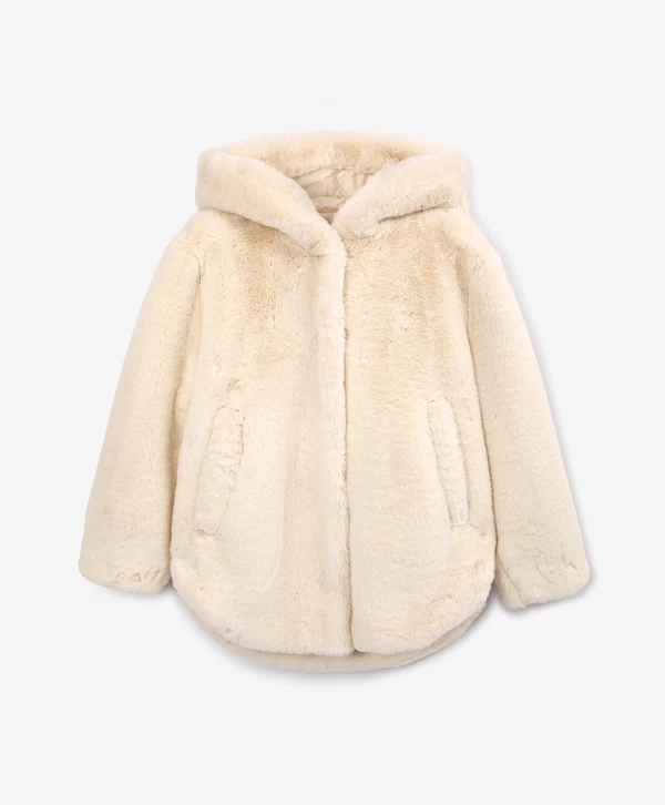 Взять свой горячий какао и наслаждаться осенней прогулкой в этой бежевой куртке из искусственного меха — истинное удовольствие! Материал невероятно мягок, шелковист и приятен на ощупь. Подкладка обеспечивает комфортное взаимодействие с изделиями первого слоя. Куртка имеет два вместительных кармана по бокам и капюшон, который защитит в случае непогоды.