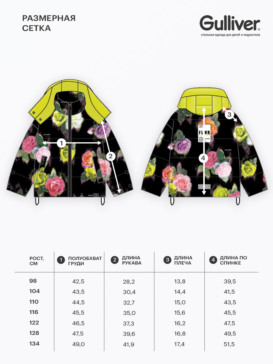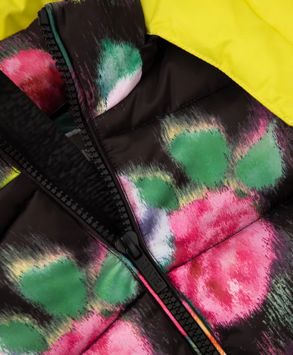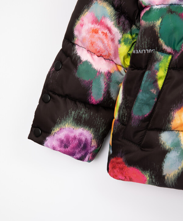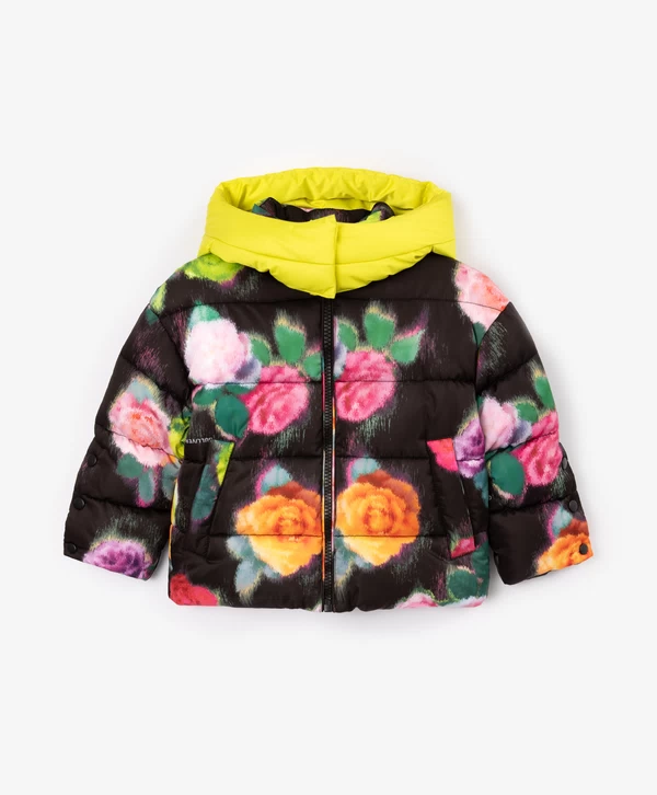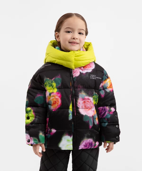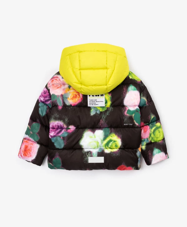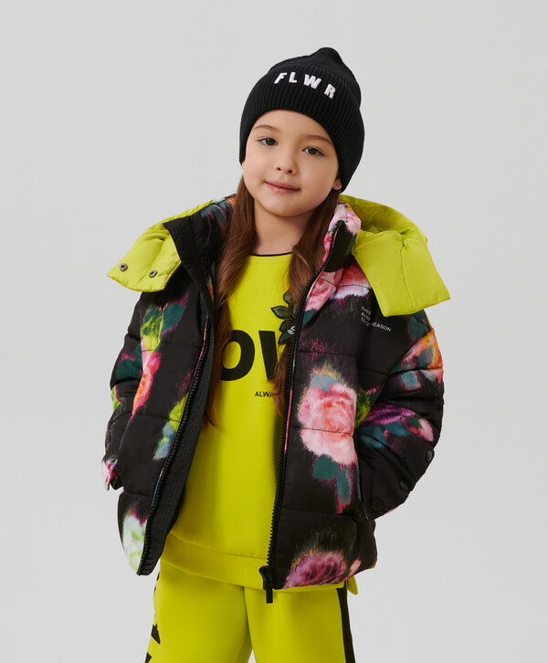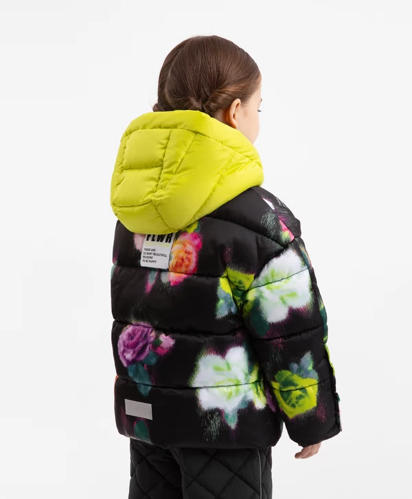 Цветы - это всегда хорошая идея! Особенно, если этот принт - главный орнаментальный мотив стеганой куртки из влагостойкой плащовки на искусственном пуху и трикотажной подкладке. Карманы на кнопках, резинки со стопперами по низу изделия, контрастный съемный капюшон на молнии и кнопках добавляют куртке функциональность. Куртка застегивается на молнию. В оформлении изделия использована нашивка с шрифтовыми элементами и светоотражающий шеврон, обеспечивающий безопасность девочки в темное время суток. Куртка будет прекрасно смотреться и с черным, и с ярким лаймовым низом.