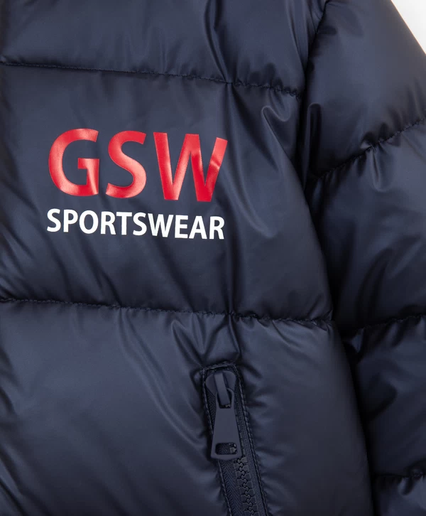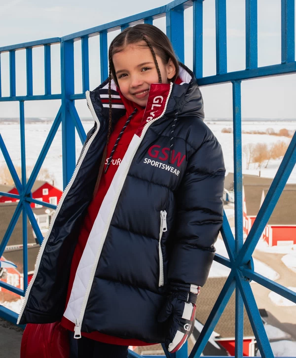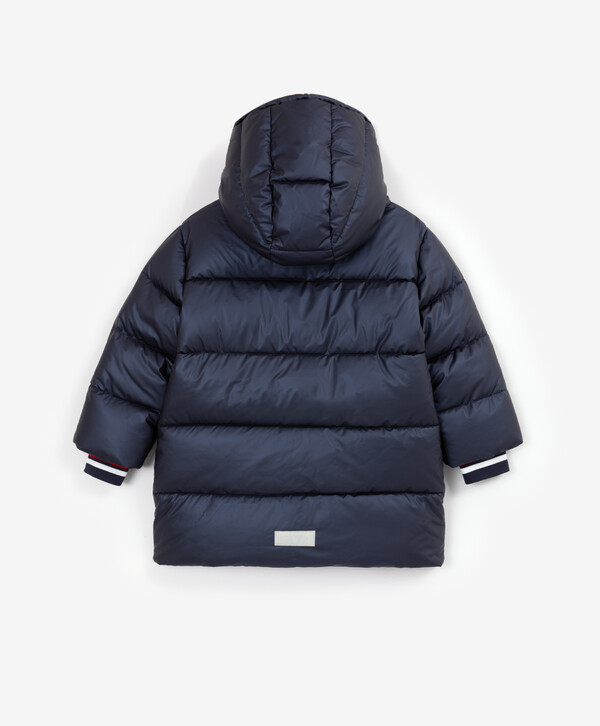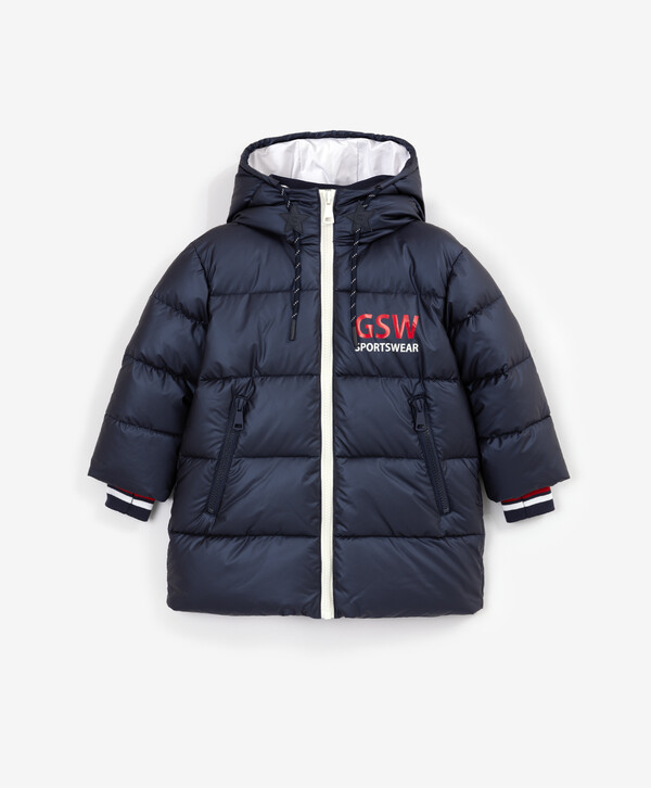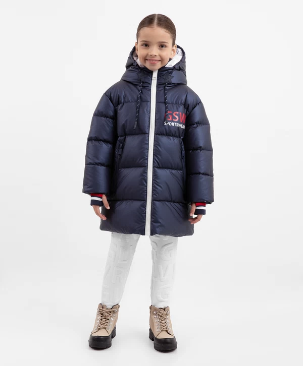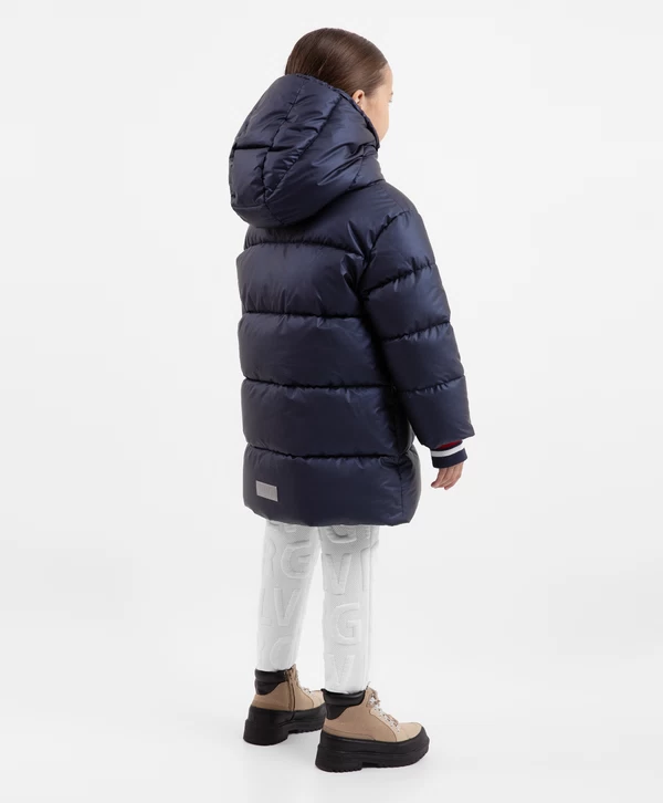 Больше не нужно искать ту самую куртку! Демисезонное тёмно-синее полупальто на искусственном пуху, выполненное из влагостойкой перламутровой плащовки, и есть тот самый универсальный и функциональный элемент верхней одежды на осенне-зимний сезон! Стёганое полупальто имеет два кармана на молниях, манжеты с прорезями для пальцев и контрастными белыми и красными полосками, капюшон с контрастными кордами. На передней части располагается шрифтовой принт, на спинке изделия — светоотражающая нашивка, способствующая безопасности девочки в тёмное время суток.