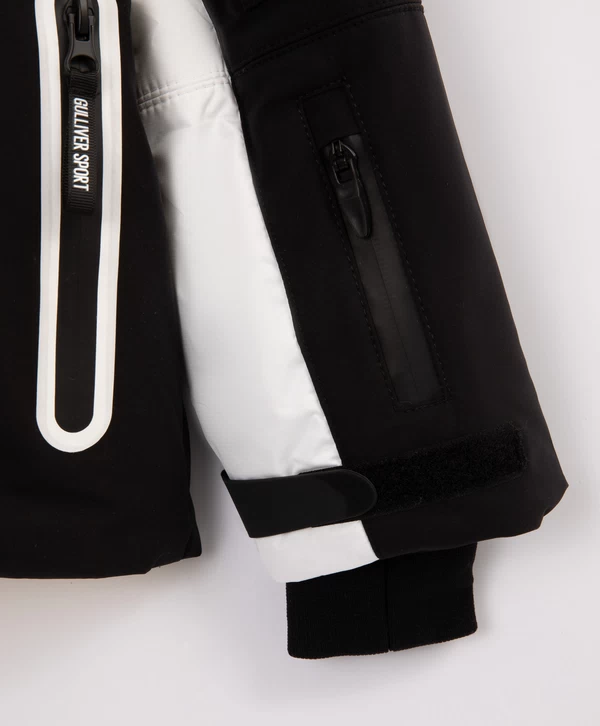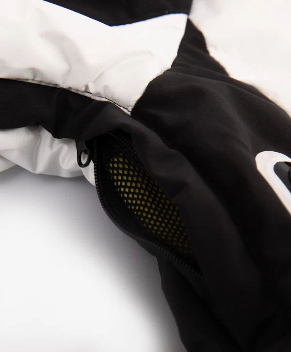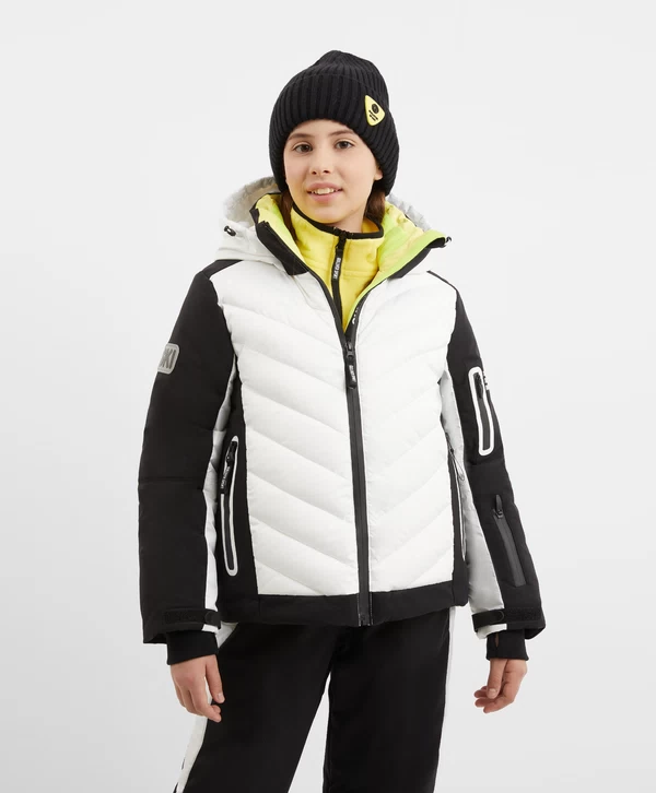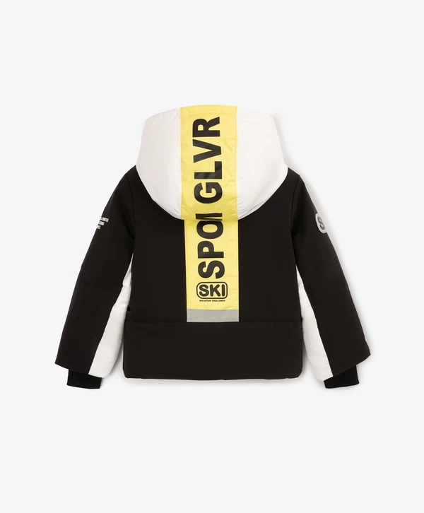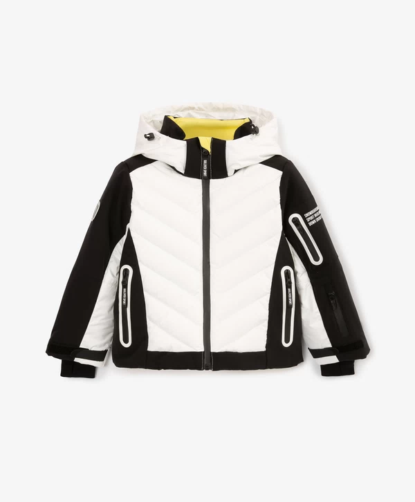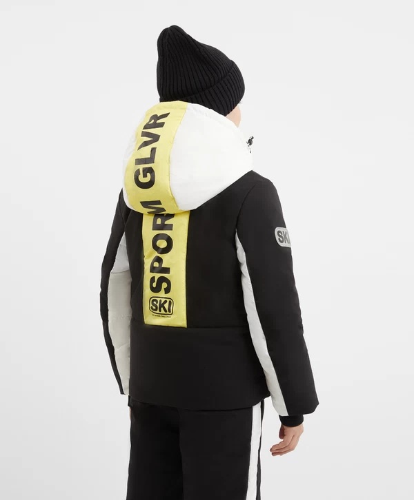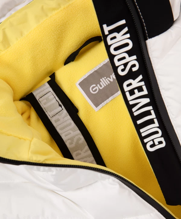 Спортивная куртка с продуманными конструктивными деталями, построенная на цветовом контрасте белого, чёрного и жёлтого, соответствует основным требованиям любительниц зимних видов спорта! Стёганая модель на искусственном пуху и подкладке из флиса выглядит интересно благодаря модному выразительному дизайну в стиле колорблок и сочетанию плотной и мягкой плащовок. Шрифтовые принты на левом рукаве, спинке и капюшоне, а также резиновый патч на правом рукаве способствуют яркому восприятию вещи и формируют модный динамичный образ девочки. Кроме того, куртка обладает целым рядом специфических деталей, важных для удобства и комфорта юной спортсменки в холодную погоду: