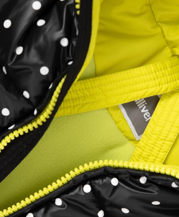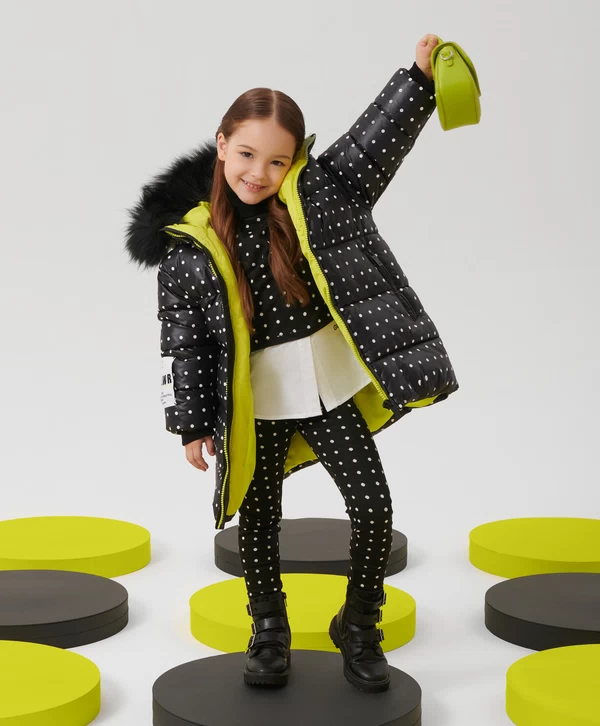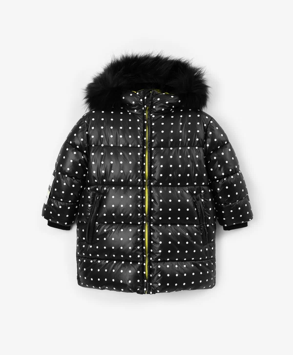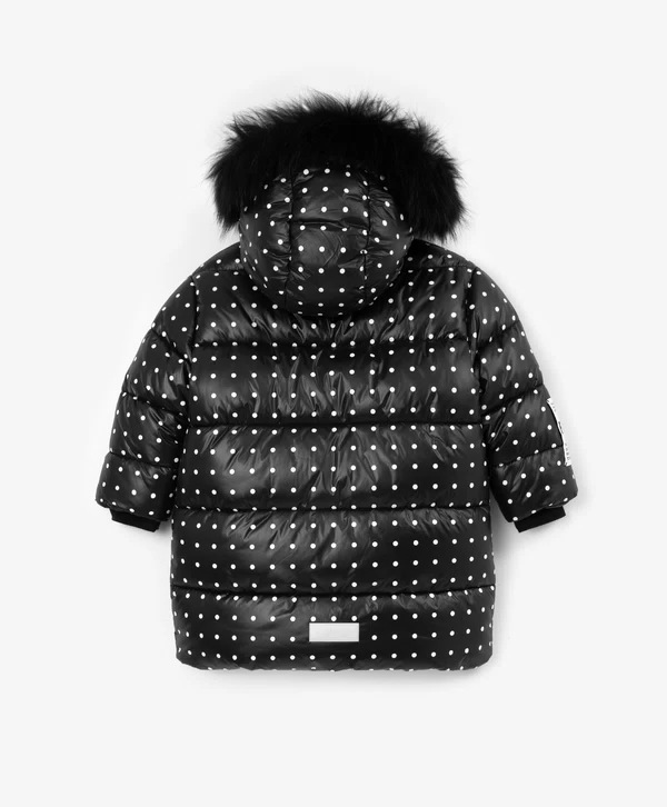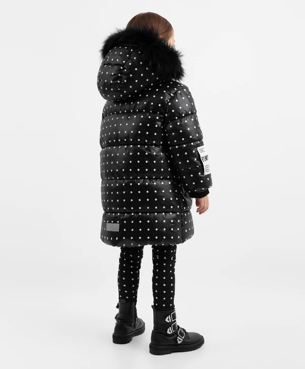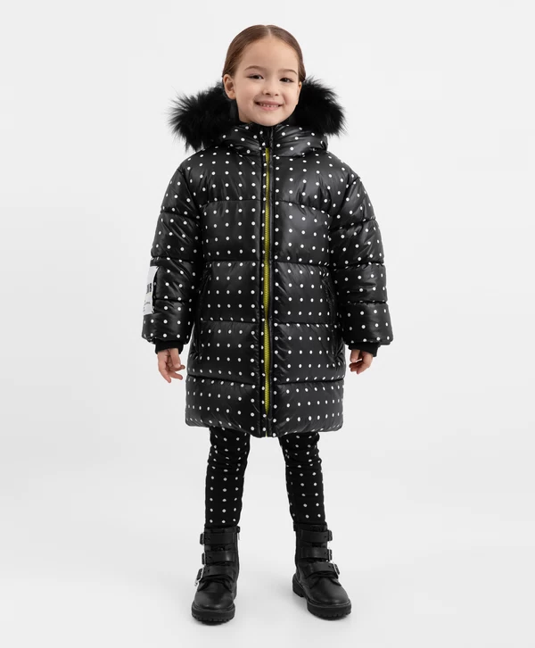 Для тех, кто предпочитает классические лаконичные принты — зимнее чёрное пальто в стильный горошек - лучший вариант для комфортного времяпрепровождения в зимний период! Изделие выполнено из блестящей влагостойкой плащовки на искусственном пуху, который обеспечит максимальное тепло, комфорт и позволит девочке насладиться долгой прогулкой. Пальто прямой свободной формы имеет два кармана на молниях, манжеты, капюшон с дополнительной утяжкой и отстёгивающимся натуральным мехом енота, резинки с регуляторами по низу изделия. Пальто застёгивается на молнию. Яркая подкладка создает цветовой контраст, добавляет изделию шарм и индивидуальность. На спинке пальто расположена светоотражающая нашивка, обеспечивающая безопасность ребёнка в тёмное время суток.