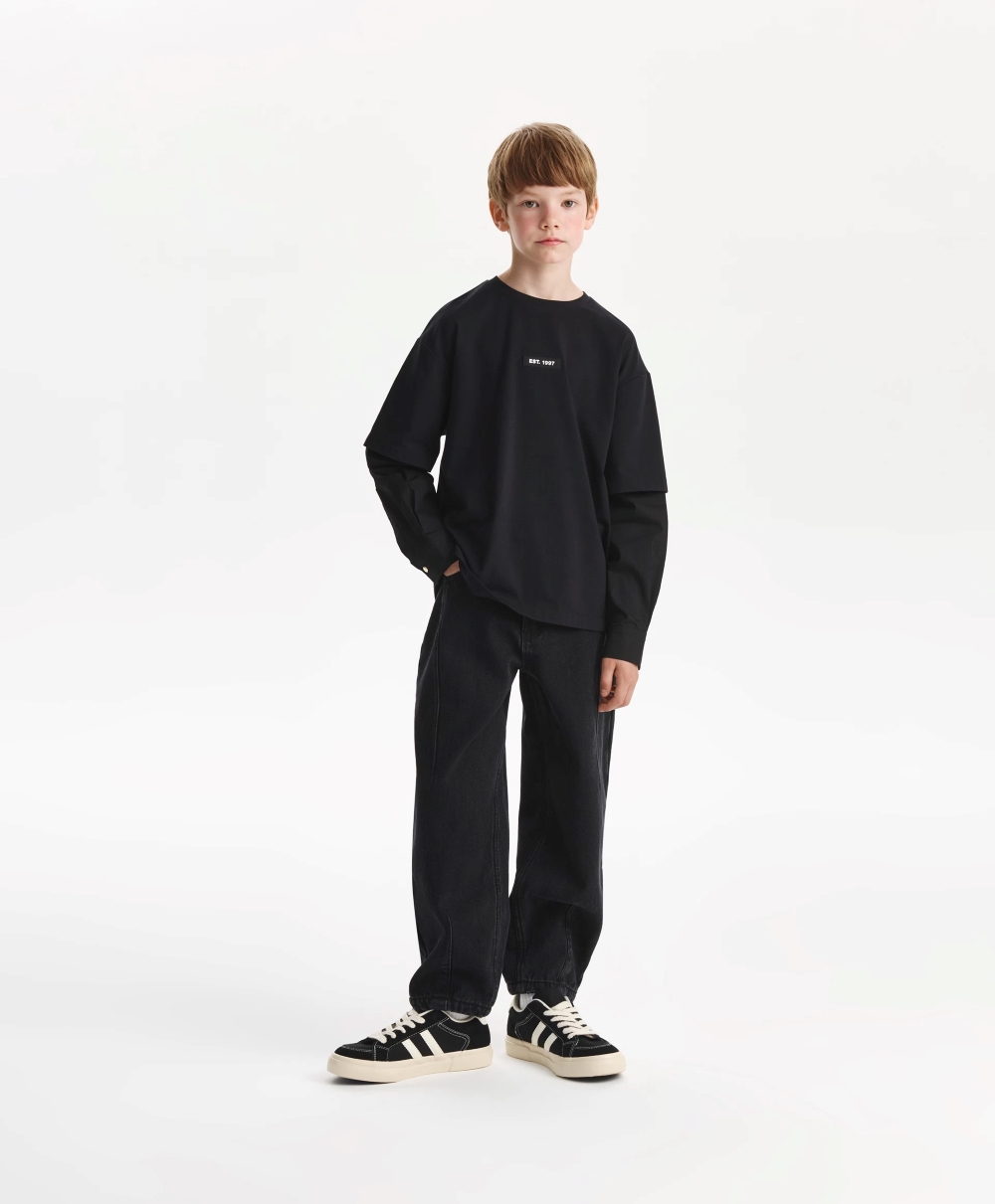 Черные джинсы на подкладке из флиса - основа осенне-зимнего прогулочного гардероба подростка. Мягкие, уютные, джинсы формы "бананы" позволят мальчику чувствовать себя комфортно в самые холодные и ненастные дни. Модная варка придает джинсам стильный современный вид. В оформлении модели использована кожаная нашивка на поясе с объемными шрифтовыми элементами. Джинсы застегиваются на молнию и пуговицу.