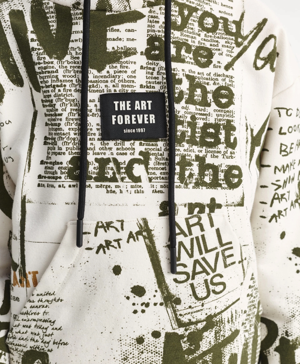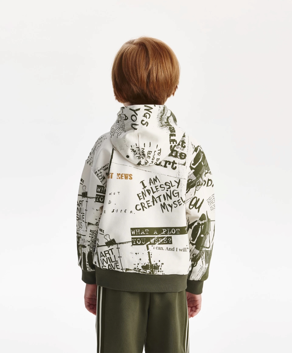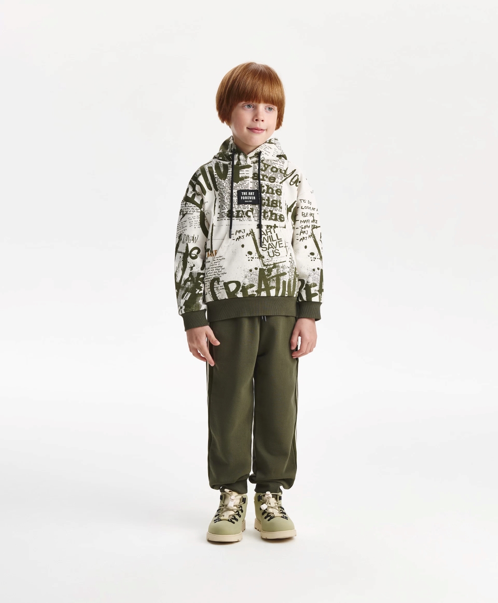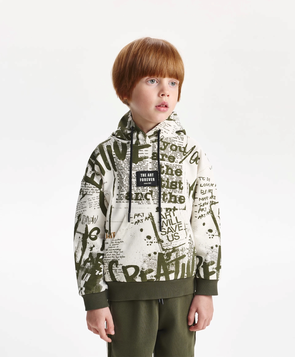 Худи с модным динамичным шрифтовым рисунком, нанесенным от руки размашисто и дезко, придаст образу мальчика уникальные черты, сделает его драйвовым, стильным, практичным, запоминающимся. Худи со спущенной линией плеч выполнено из мягкого хлопкового френч-терри с петельчатой изнанкой. Классические детали, без которых не обходится ни одно худи: капюшон, карман-кенгуру, манжеты и низ изделия из риба дополнены оригинальной нашивкой, в которую можно продеть корды, сделав на этом акцент.