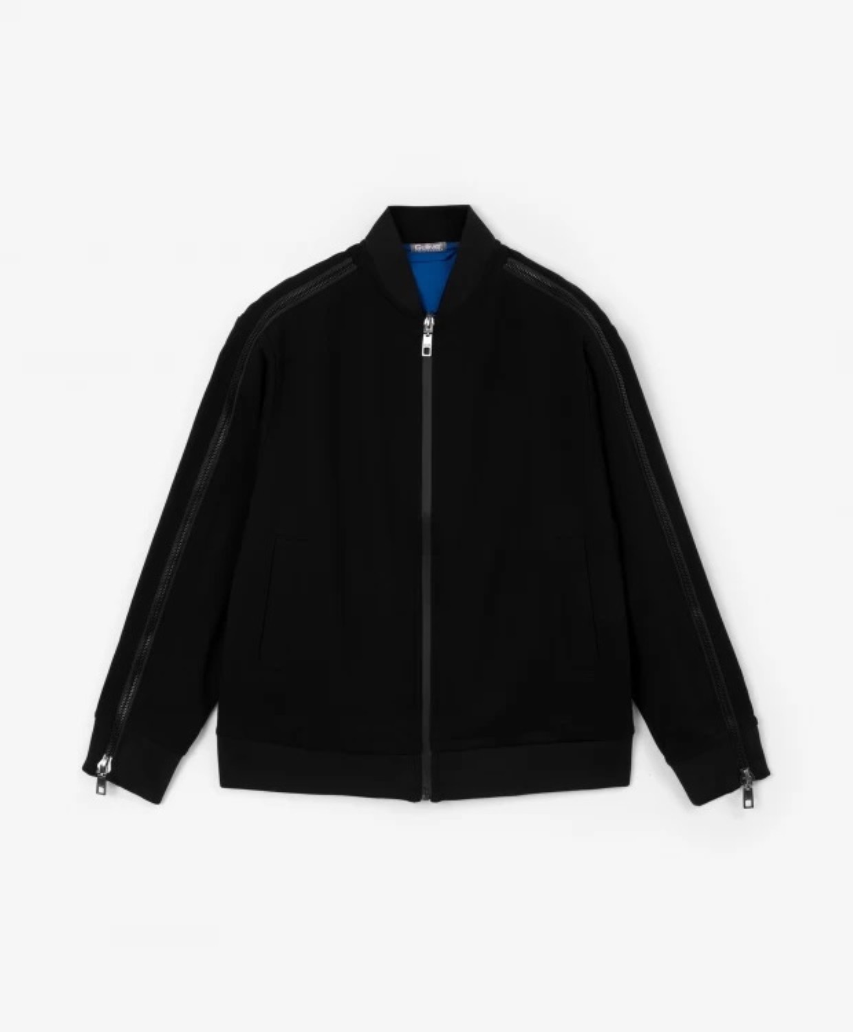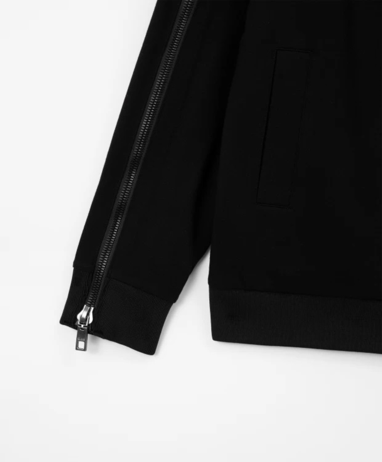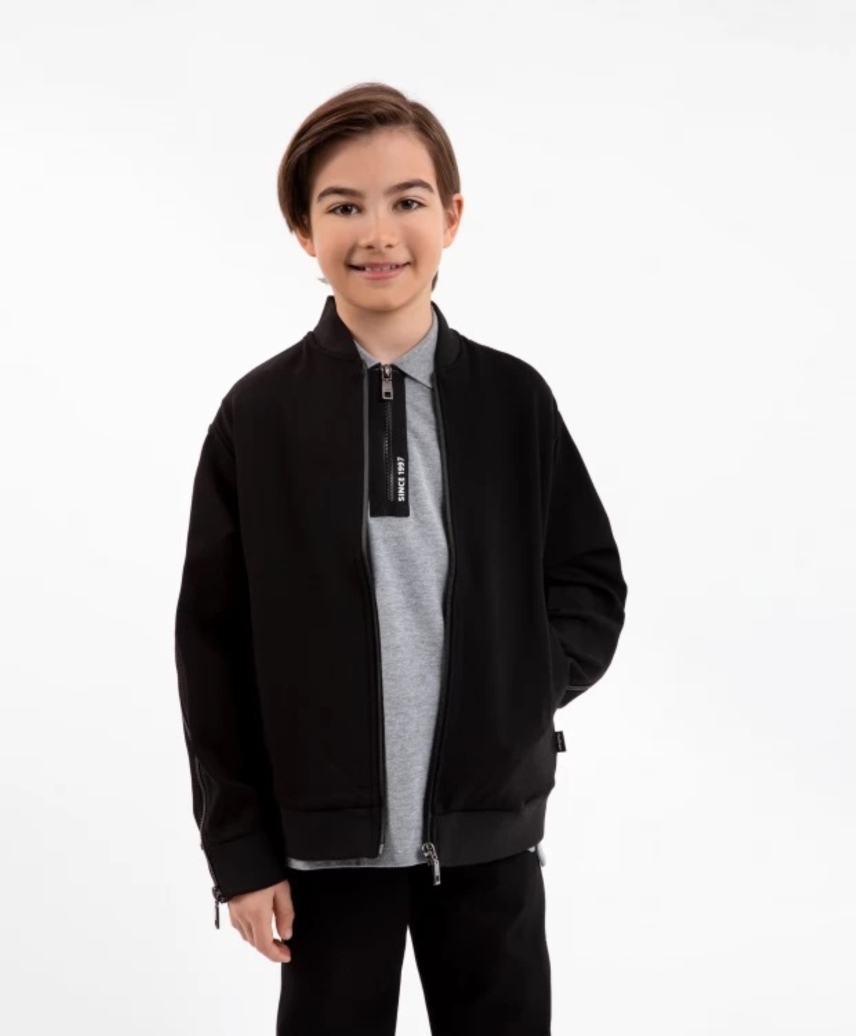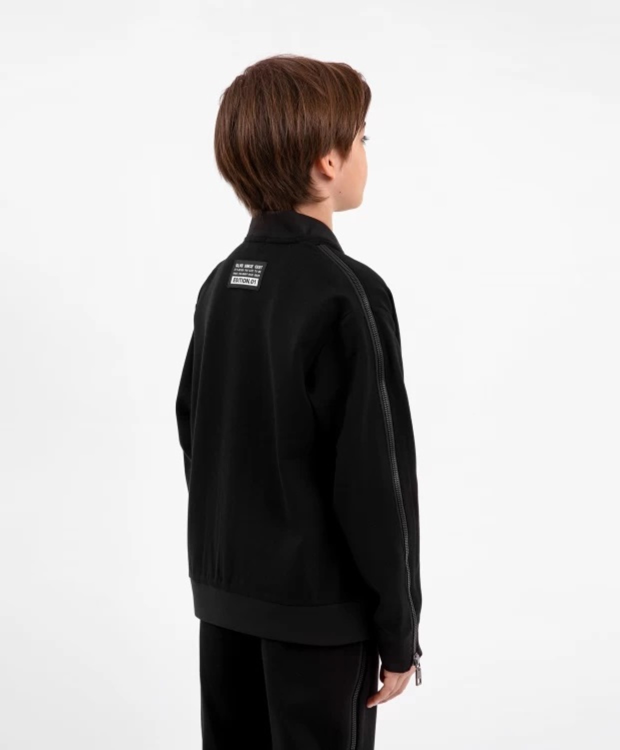 Черная распашная толстовка - отличная альтернатива пиджаку или кардигану. Если в школе приветствуются комфортные образы в стиле casual и sport в цветовых рамках дресс-кода, черная толстовка из плотного, формоустойчивого и практичного джерси - лучшее решение для будней мальчика. Дизайн модели акцентирует внимание на крупных молниях в цвет основного материала, расположенных в средней части  рукавов и переходящих в плечевые швы. Это делает базовую по форме толстовку интереснее, брутальнее, ярче. Молнии расстегиваются с низа до верха, но носят ложный характер. В оформлении толстовки использована лаконичная жаккардовая нашивка с шрифтовыми элементами.