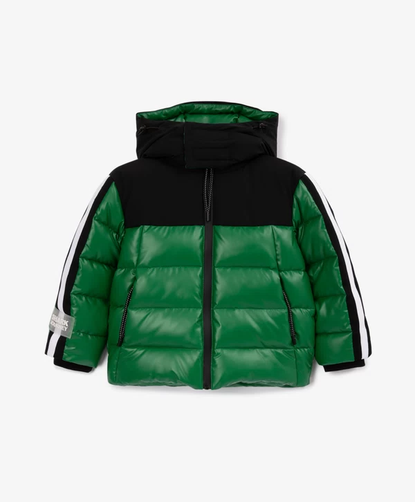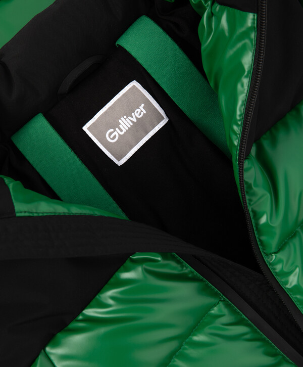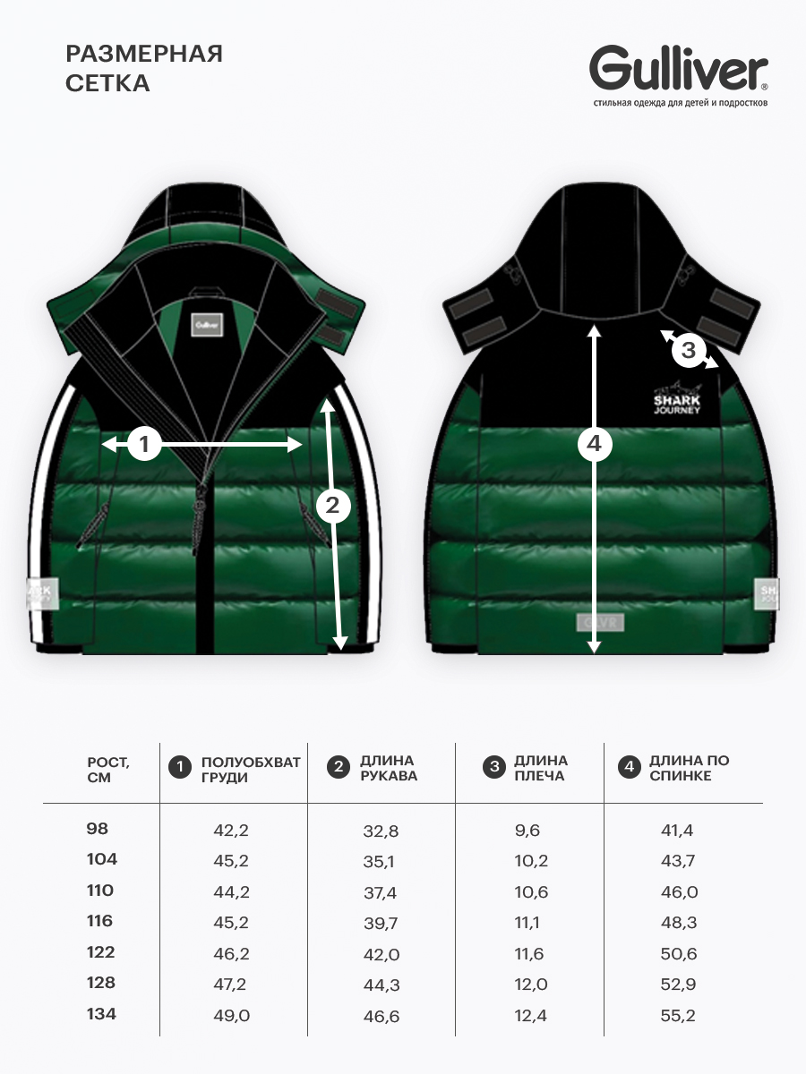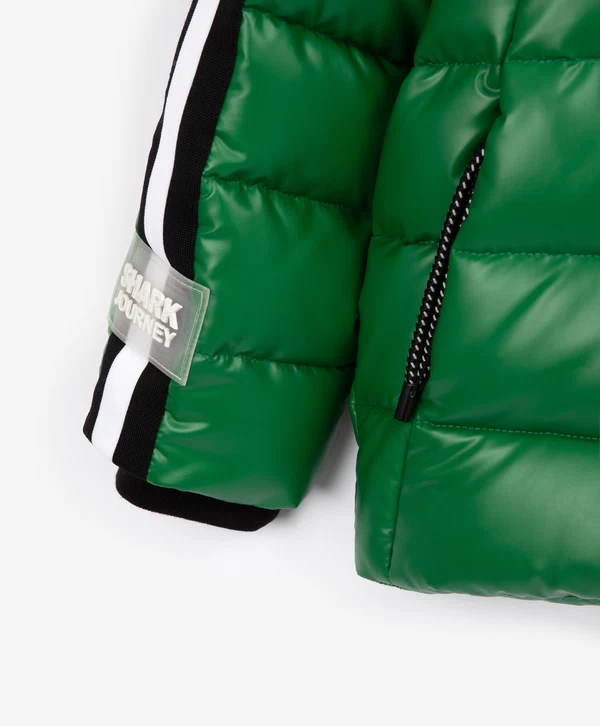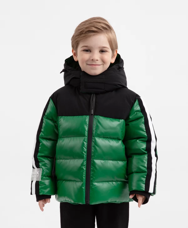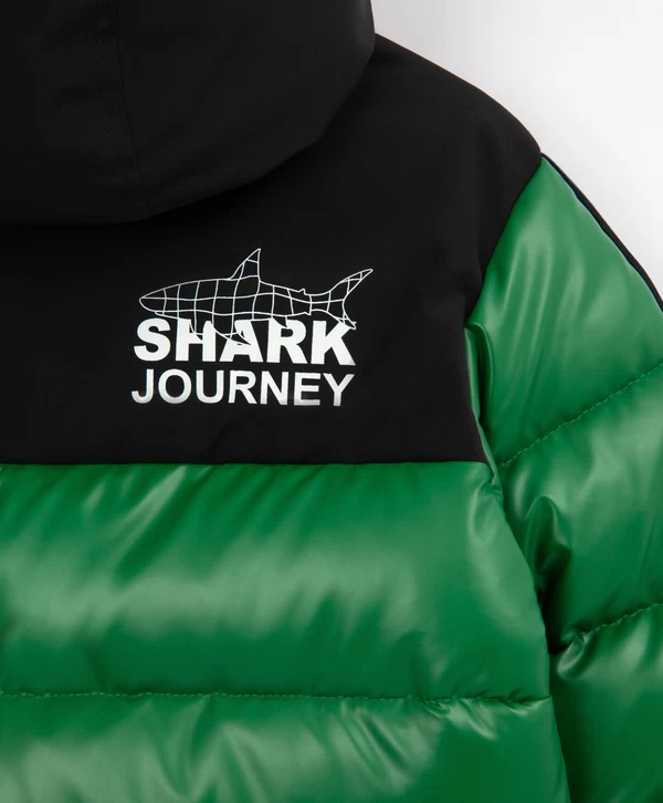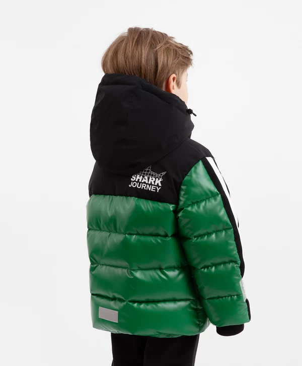 Создана для того, чтобы защищать мальчика от любых капризов погоды! Зелёная демисезонная куртка выполнена из блестящей и матовой плащовок на искусственном пуху, которые не только обеспечивают надёжную защиту от влаги и холода, но и выглядят стильно, выразительно, современно. Дизайн модели построен по принципу колорблокинга — сочетание чёрного и зелёного смотрится очень интересно и небанально. Отделка репсовой тесьмой на рукавах и капюшоне создаёт цветовой контраст и придаёт модели законченный вид. Куртка имеет два кармана на молнии, манжеты и капюшон с дополнительной утяжкой и текстильной застёжкой-липучкой. Она оснащена внутренними лямками, позволяющими в помещении носить ее за спиной как рюкзак. В оформлении модели использованы резиновая нашивка с шрифтовыми элементами и небольшой принт с интересной графикой и надписью «Shark journey» («Путешествие с акулами»), а также светоотражающий патч, способствующий безопасности мальчика в тёмное время суток.