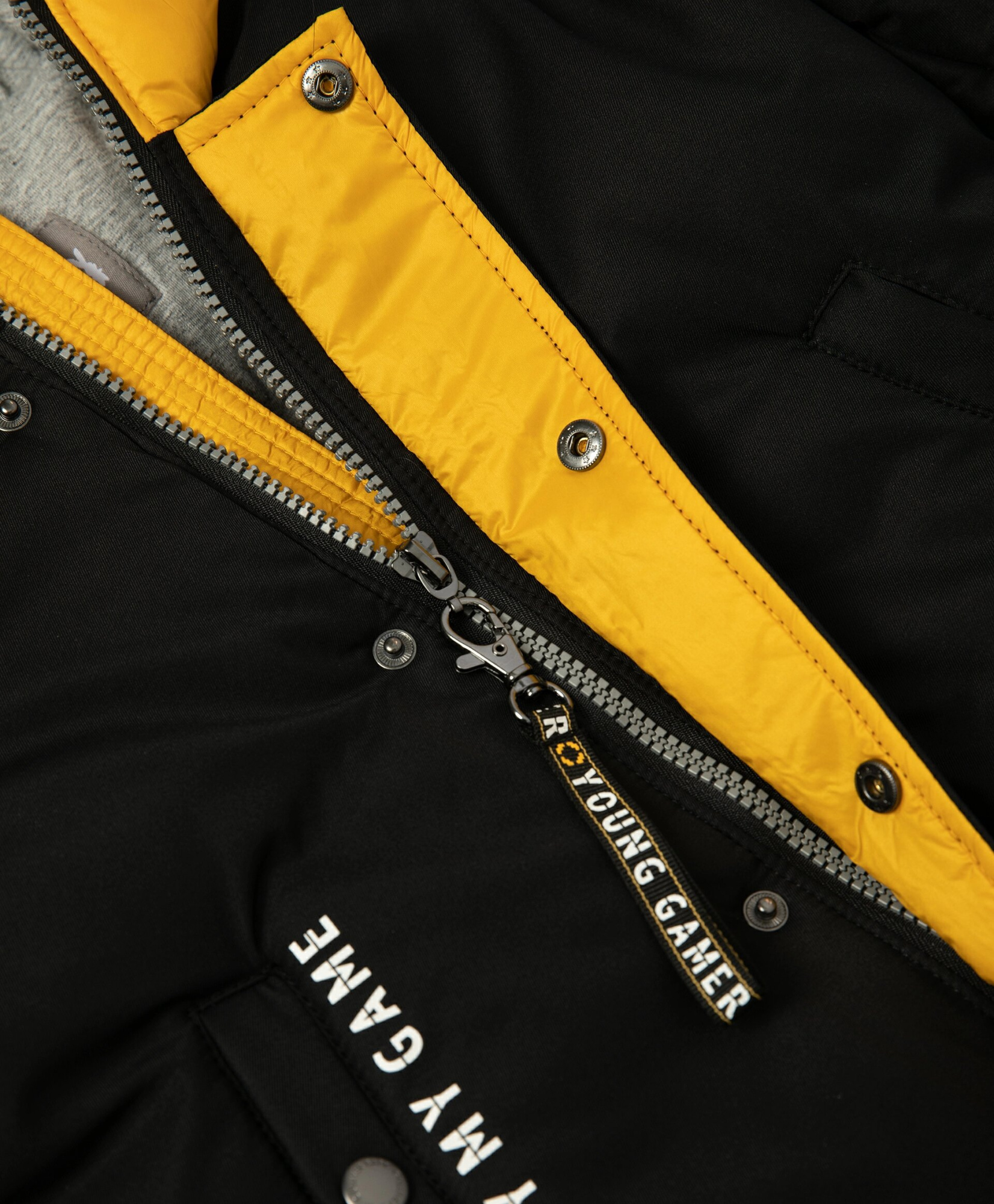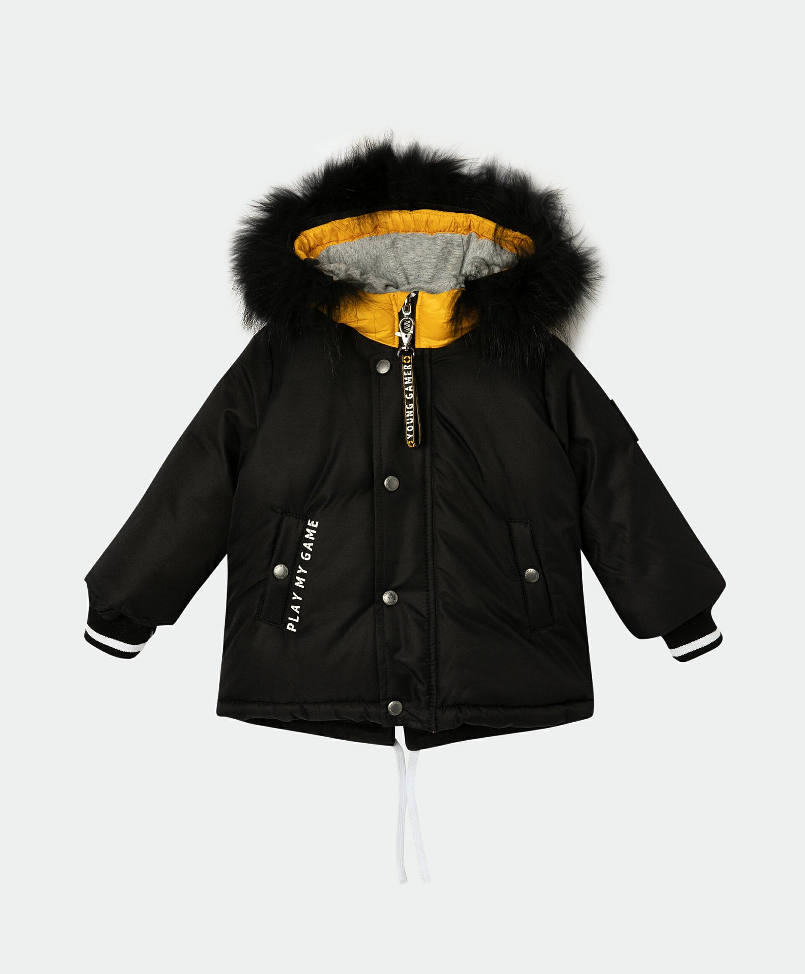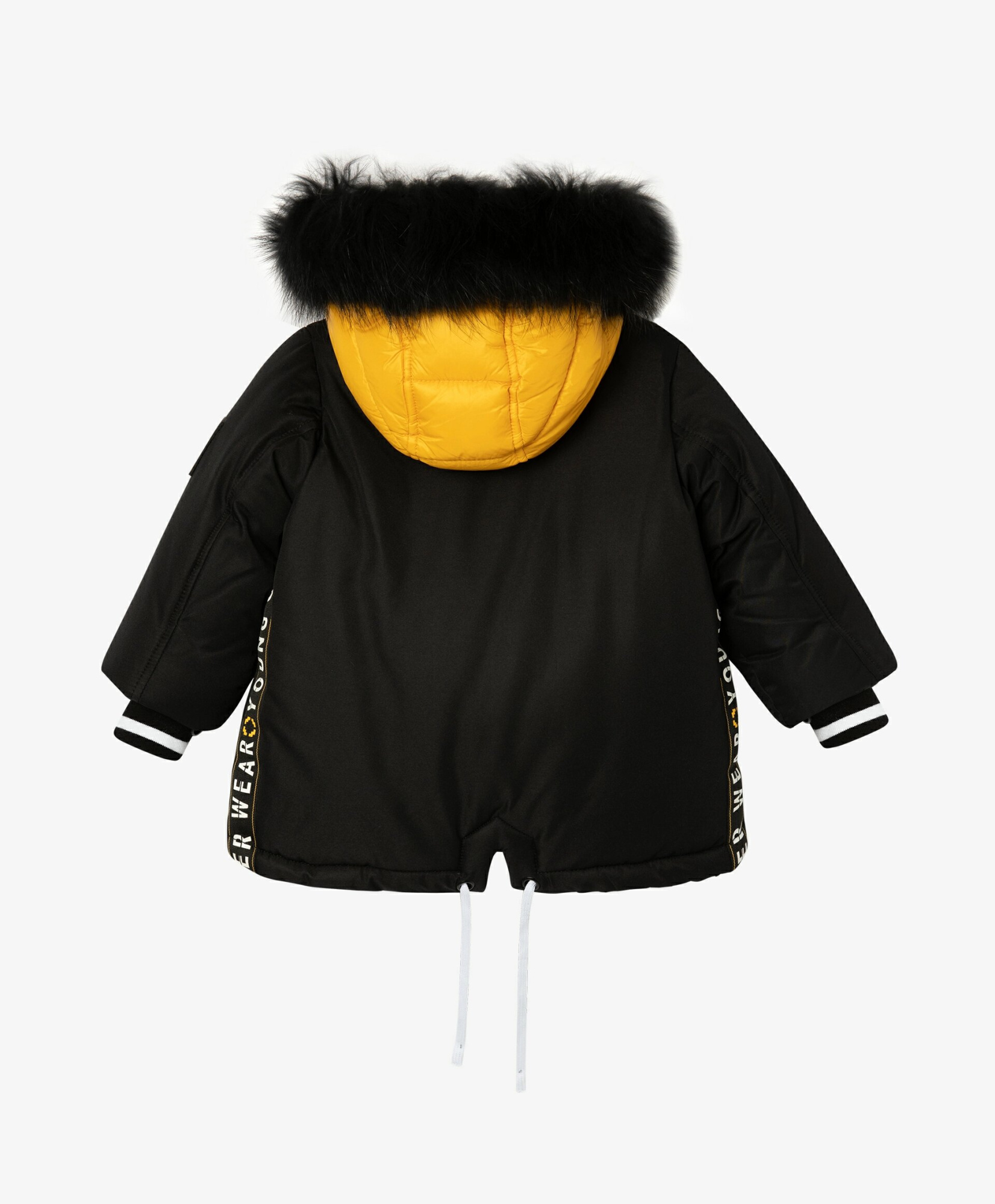 Черная куртка-парка на искусственному пуху - незаменимая вещь для продолжительных зимних прогулок. Созданная с соблюдением основных требований функциональности и комфорта, парка на мягкой трикотажной подкладке гарантирует тепло и уют. Комбинация двух видов плащевок: черной плотной и мягкой контрастной с мокрым благородным блеском, подчеркивает интересный дизайн модели, делает парку стильной, брутальной, запоминающейся. В оформлении модели использованы декоративные элементы коллекции: полимерный принт под входом в карман, жаккардовая тесьма со шрифтовым наполнением на боковых швах изделия, яркий шеврон с имитацией пикселей на рукаве, навесной пулер на молнию, выполненный из принтованной тесьмы. Натуральный мех енота на капюшоне придает модели завершенность и делает куртку по-настоящему теплой и зимней по восприятию.