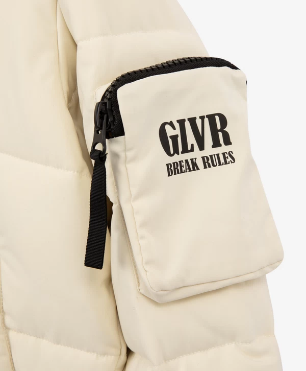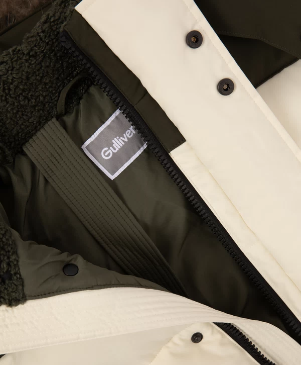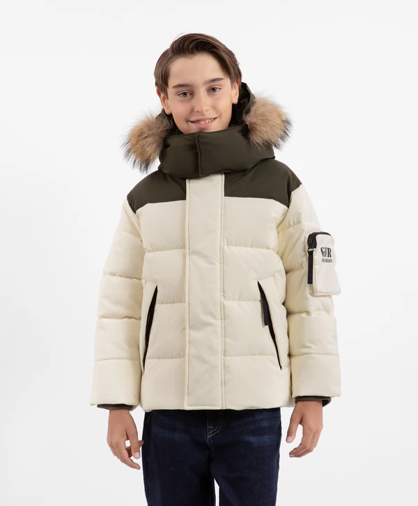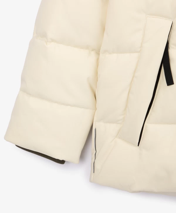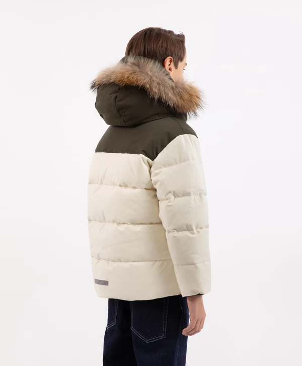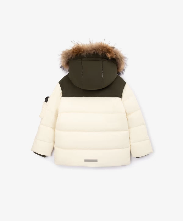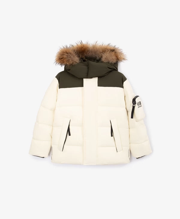 Стёганая куртка на искусственном пуху, построенная на цветовом контрасте молочного и хаки, станет идеальным вариантом на зиму! Изделие выполнено из влагостойкой матовой плащовки. Функциональные детали, которые делают эту куртку модной, продуманной и практичной — два вместительных кармана на молнии, объёмный накладной карман на рукаве с шрифтовыми элементами, отстёгивающийся капюшон с натуральным мехом енота и манжеты. Воротник с внутренней стороны отделан искусственным мехом.