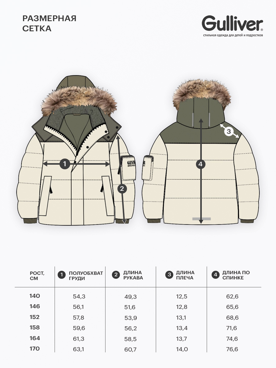 Куртка застёгивается на молнию и кнопки. На спинке изделия расположен светоотражающий элемент, способствующий безопасности мальчика в тёмное время суток. Куртка имеет внутренние лямки, позволяющие в помещении носить её за спиной как рюкзак. Куртка составит завершённый утеплённый комплект с зимними плащевыми брюками цвета хаки 22411BJC6405 или другими утеплёнными изделиями.