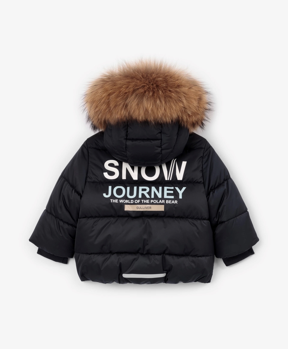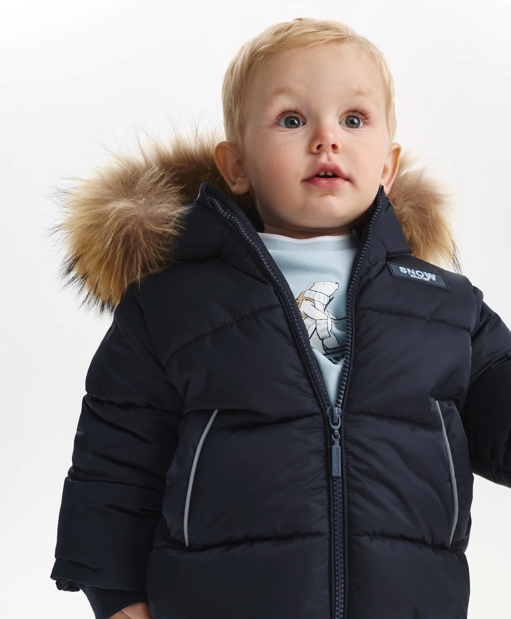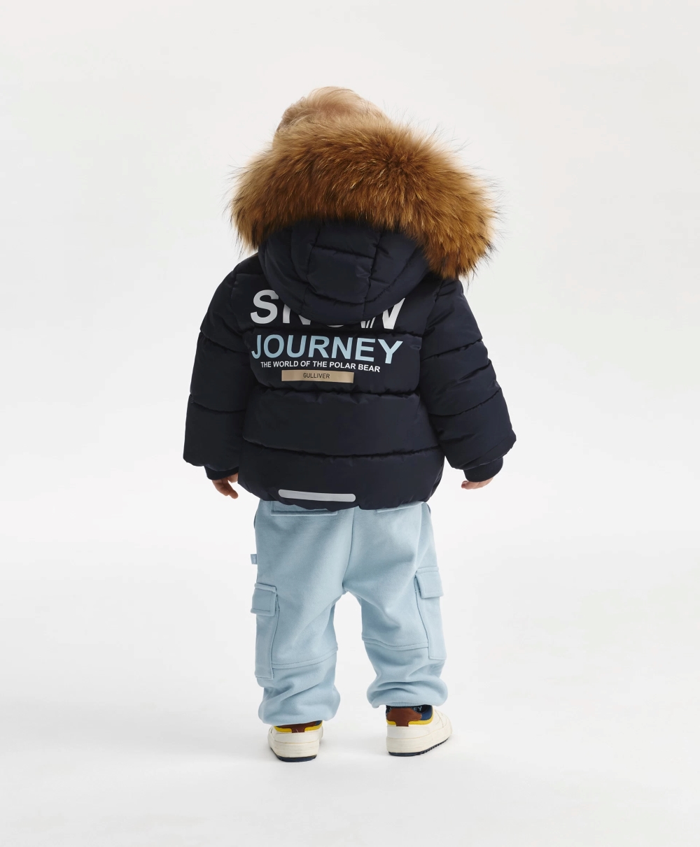 Стёганая зимняя куртка из влагостойкой плащовки на искусственном пуху и мягкой трикотажной подкладке проявит себя с лучшей стороны в суровых зимних условиях. Важные функциональные детали: удобные карманы-листочки, трикотажные манжеты, утяжка капюшона, отстегивающаяся опушка из натурального меха енота делают куртку продуманной и практичной, способной обеспечить мальчику 100% комфорт.  Акцентным элементом модели является крупный шрифтовой принт на спинке, поддержанный резиновой нашивкой на передней части и светоотражающими элементами, способствующими безопасности мальчика на прогулке в темное время суток. Они подчеркивают стильный лаконичный дизайн модели, делая куртку основой зимнего гардероба. Куртка застёгивается на молнию с ветрозащитной планкой и специальным "язычком", исключающим контакт фурнитуры с кожей мальчика. Светоотражающие элементы способствуют безопасности ребенка на прогулке в темное время суток.