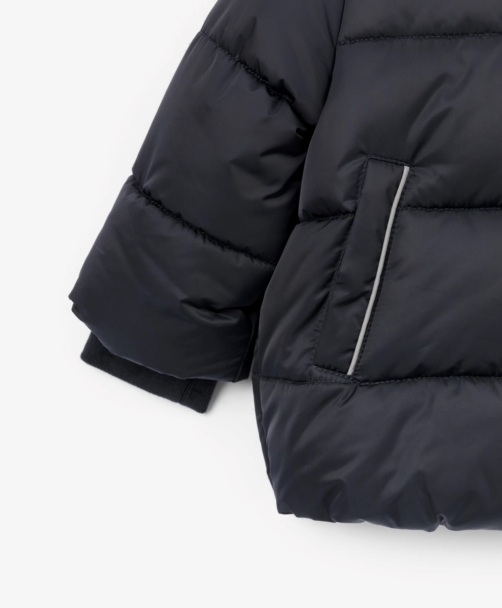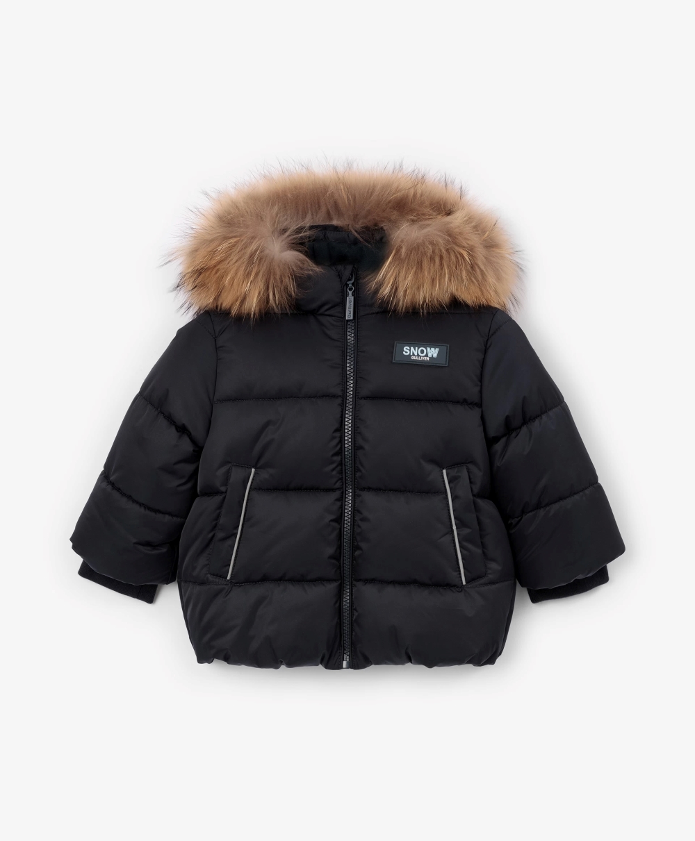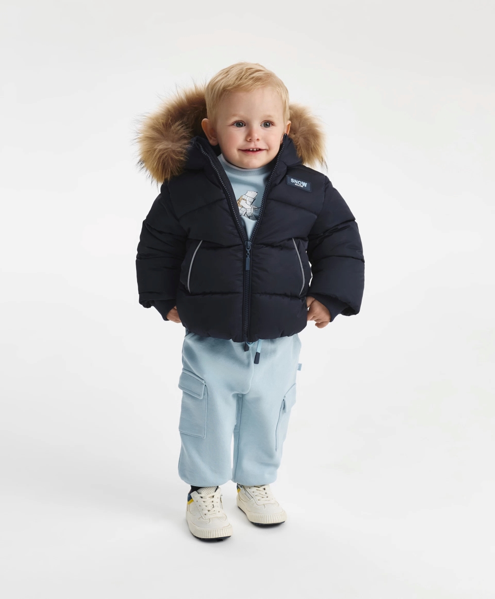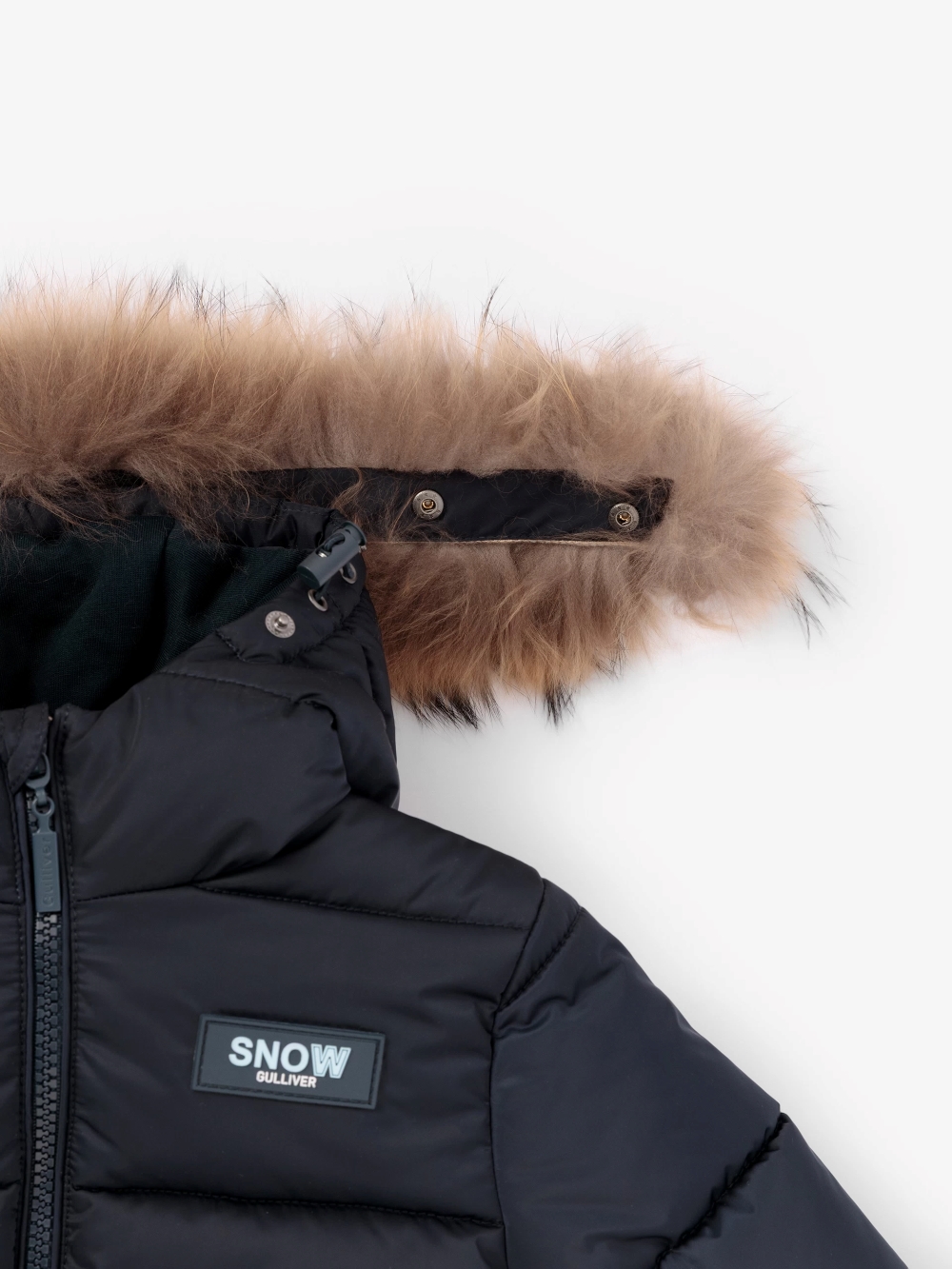 Стёганая зимняя куртка из влагостойкой плащовки на искусственном пуху и мягкой трикотажной подкладке проявит себя с лучшей стороны в суровых зимних условиях. Важные функциональные детали: удобные карманы-листочки, трикотажные манжеты, утяжка капюшона, отстегивающаяся опушка из натурального меха енота делают куртку продуманной и практичной, способной обеспечить мальчику 100% комфорт.  Акцентным элементом модели является крупный шрифтовой принт на спинке, поддержанный резиновой нашивкой на передней части и светоотражающими элементами, способствующими безопасности мальчика на прогулке в темное время суток. Они подчеркивают стильный лаконичный дизайн модели, делая куртку основой зимнего гардероба. Куртка застёгивается на молнию с ветрозащитной планкой и специальным "язычком", исключающим контакт фурнитуры с кожей мальчика. Светоотражающие элементы способствуют безопасности ребенка на прогулке в темное время суток.
