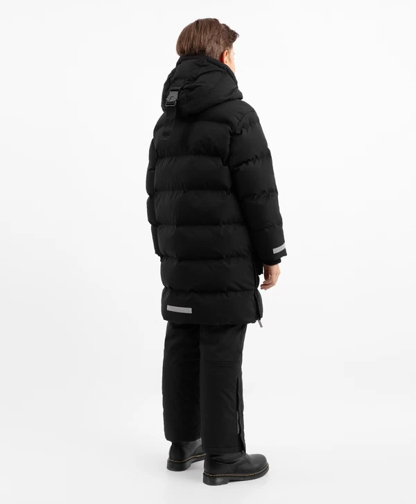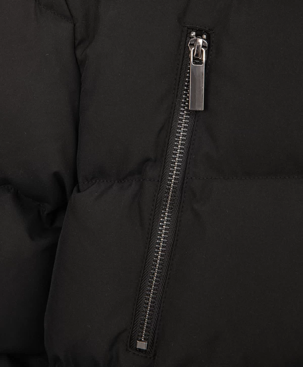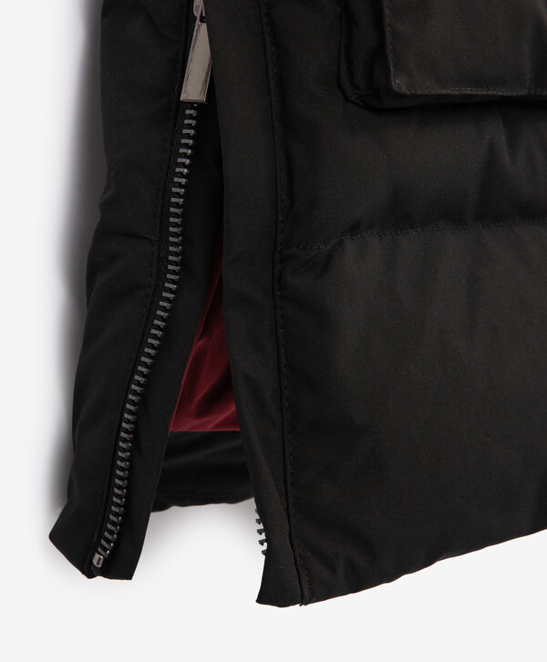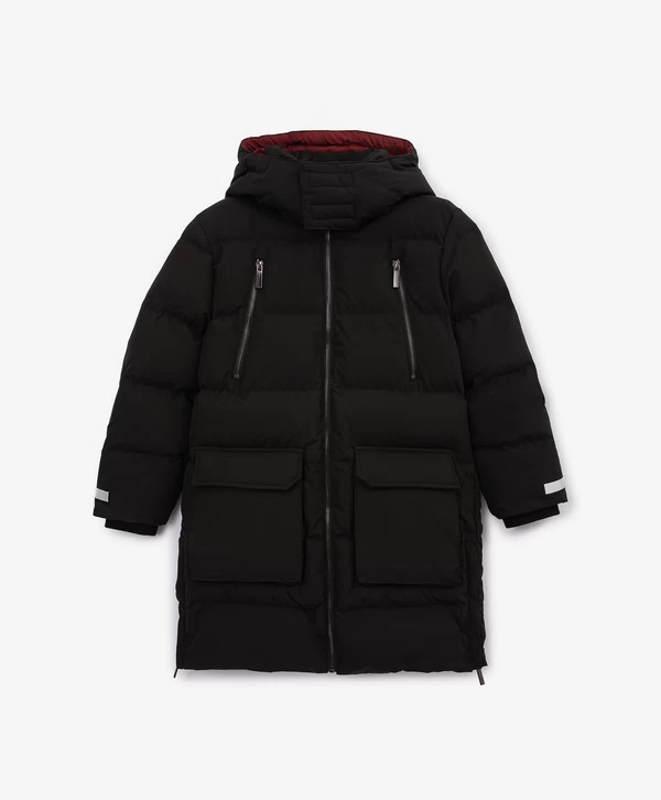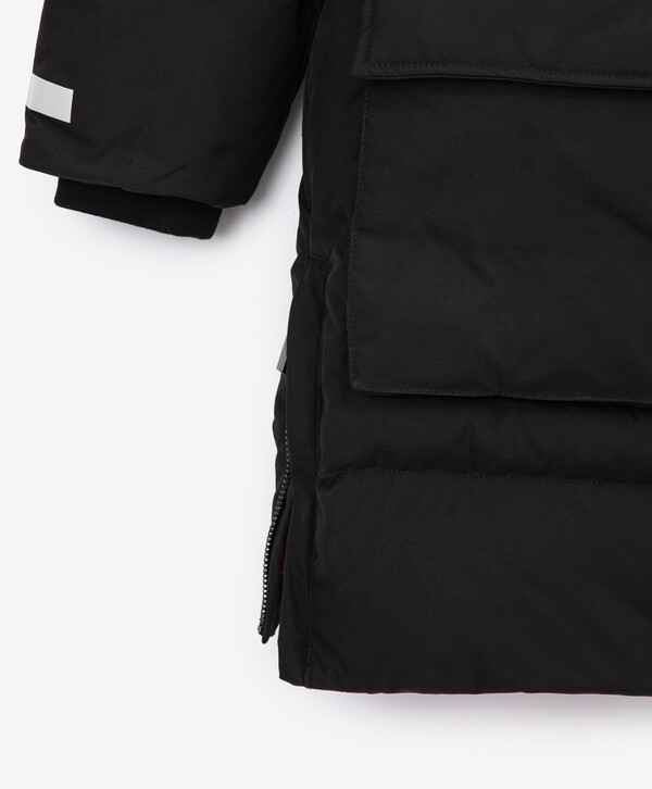 Чёрное зимнее полупальто на искусственном пуху, сочетающее в себе все актуальные тренды, выполнено из прочной матовой плащовки, обладающей прекрасной влагонепроницаемостью и ветрозащитными свойствами, поэтому в нем никакие осадки и холода не страшны! Дизайн модели построен на колорблокинге и сочетании принтованной и однотонной плащовок. Модный и функциональный элемент - молнии в боковых швах, способствующие комфортному шагу. Полупальто имеет два нагрудных кармана на молниях, накладные вместительные карманы с клапанами, капюшон с фастексом и манжеты.