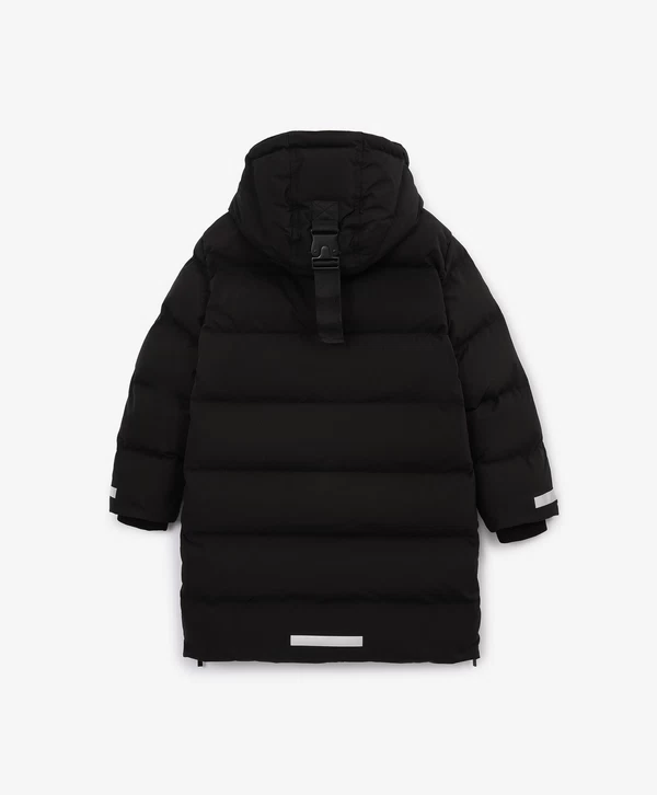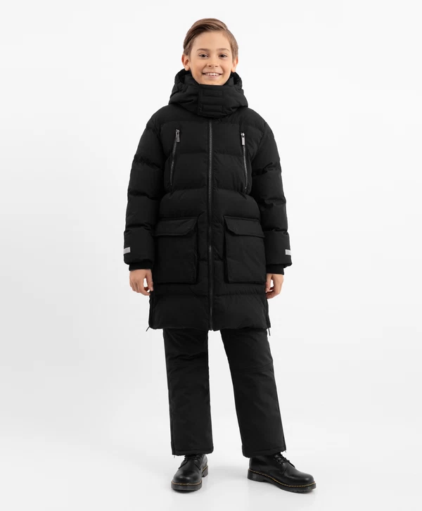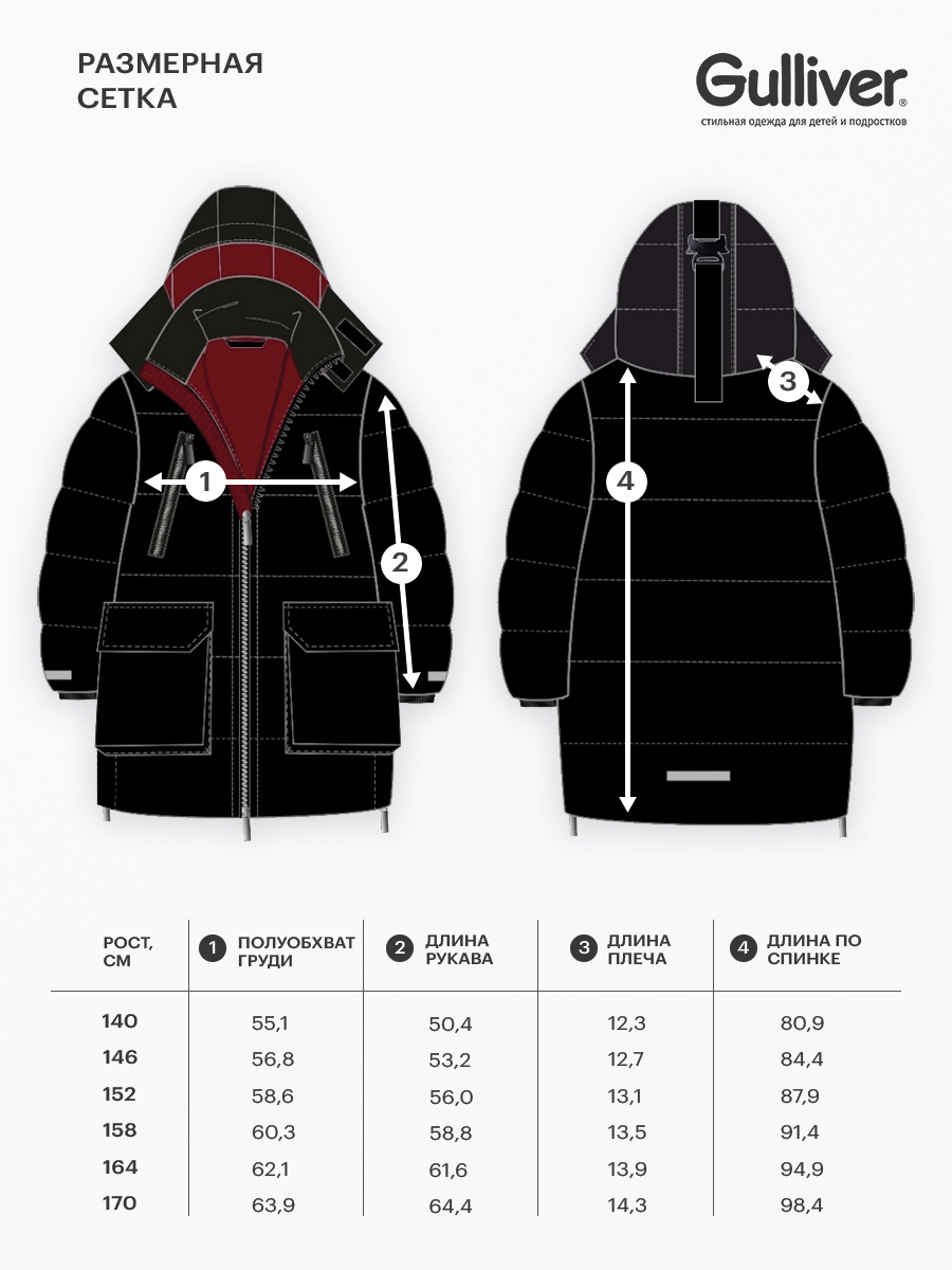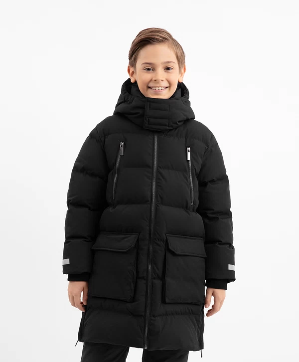 Полупальто застёгивается на молнию. На спинке и рукавах изделия расположены светоотражающие элементы, способствующие безопасности мальчика в тёмное время суток.