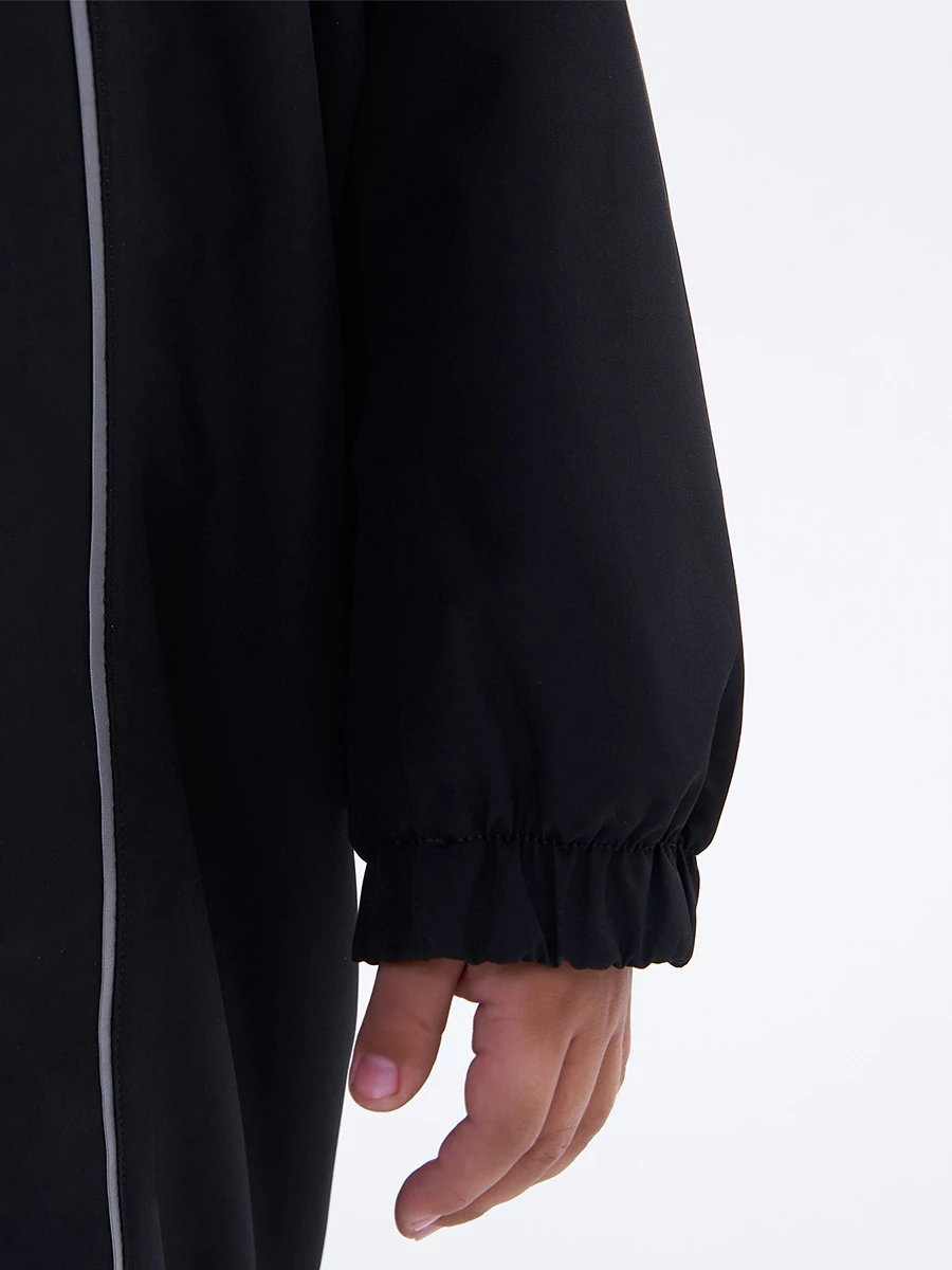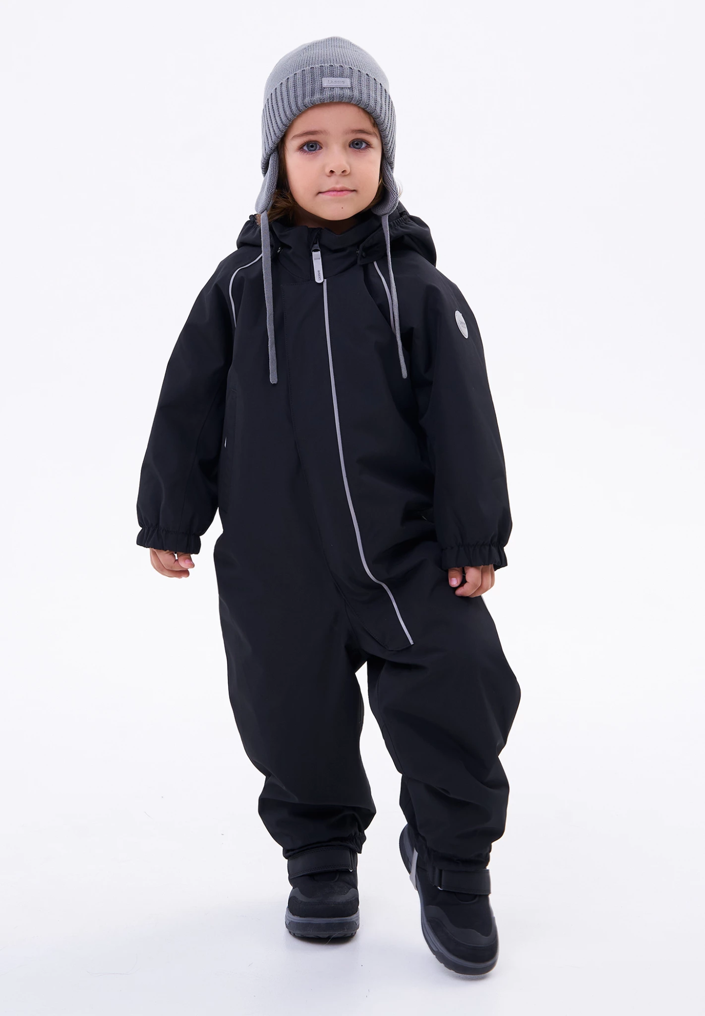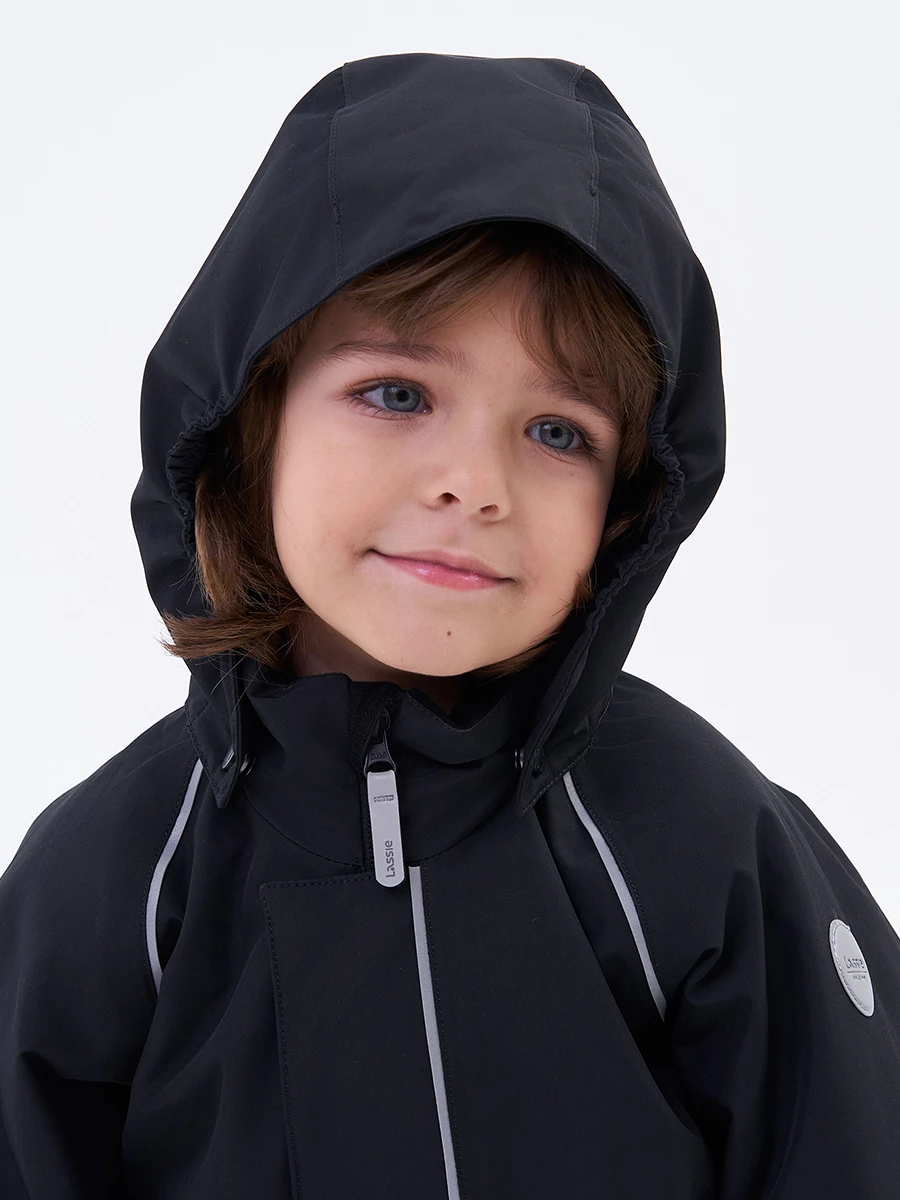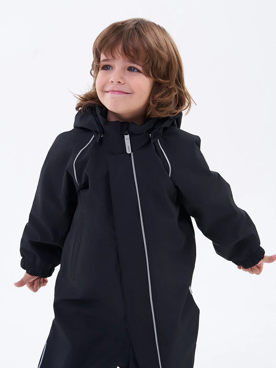 Комбинезон рассчитан на температуру от +5°C до -10°C. Модель имеет безопасный съемный капюшон с регулировкой. Эластичные манжеты на рукавах и съемные штрипки защищают от ветра. На воротнике и капюшоне вставки из флиса и гладкая подкладка. Комбинезон можно регулировать по талии. На груди расположен карман на молнии. Есть светоотражающие элементы. Изготовлен из таслана. Материал имеет водо- и грязеотталкивающую пропитку без фторуглеродов.
