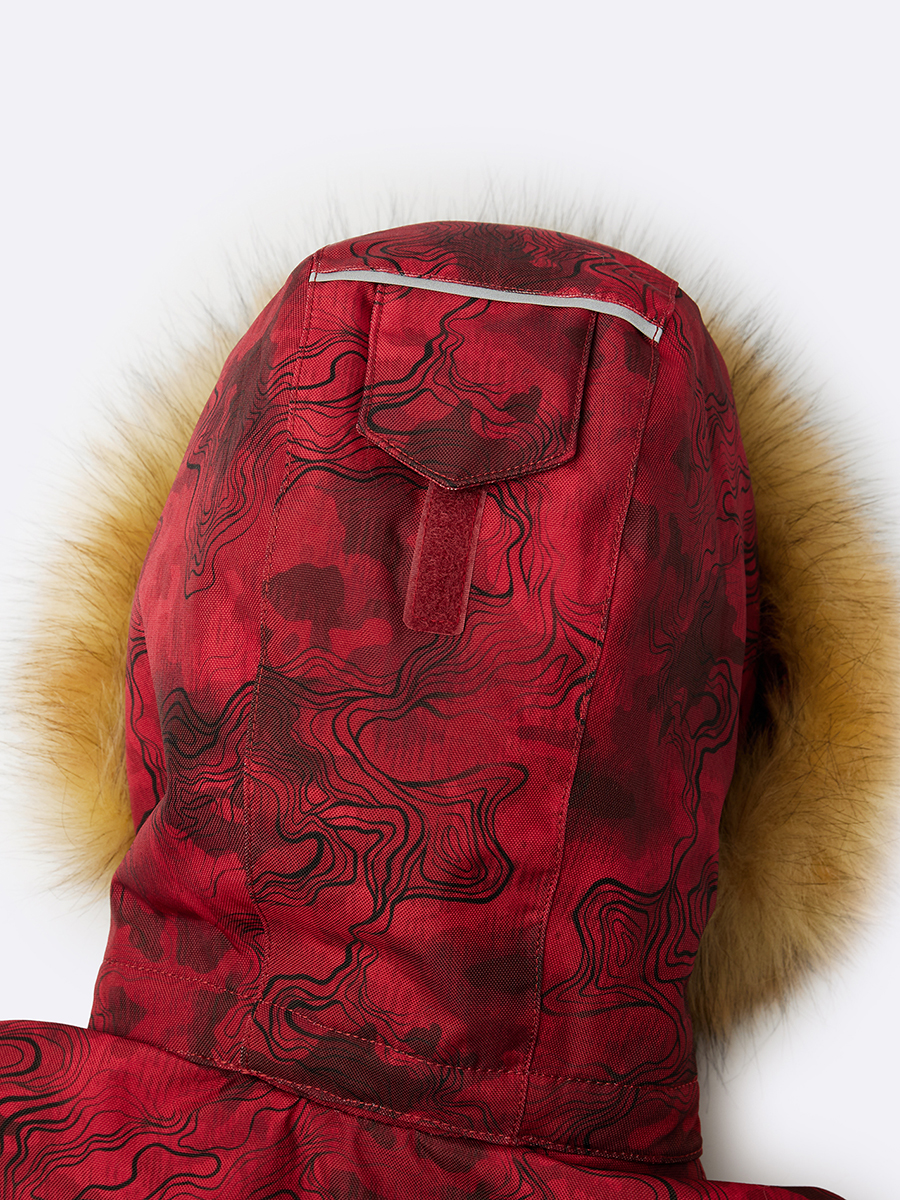 Капюшон с мехом плотно прилегает к лицу, защищая от холодного ветра и сохраняя тепло