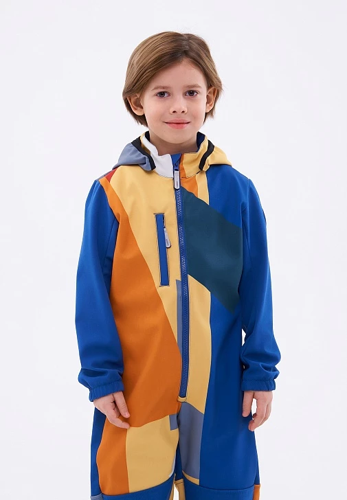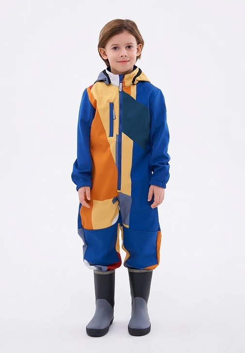 Рассчитан на температуру от +5°C до +15°C. Безопасный съемный капюшон и эластичные манжеты на рукавах защищают от ветра. Съемные силиконовые штрипки надежно фиксируют одежду. Модель имеет усиленные вставки в области коленей. Внутренние лямки позволяют легко снять комбинезон в помещении, чтобы не было жарко. Есть нагрудный карман на молнии.Изготовлен из софтшелла с флисовой подкладкой. Водо- и грязеотталкивающая пропитка без содержания фторуглеродов защищает от влаги и загрязнений.