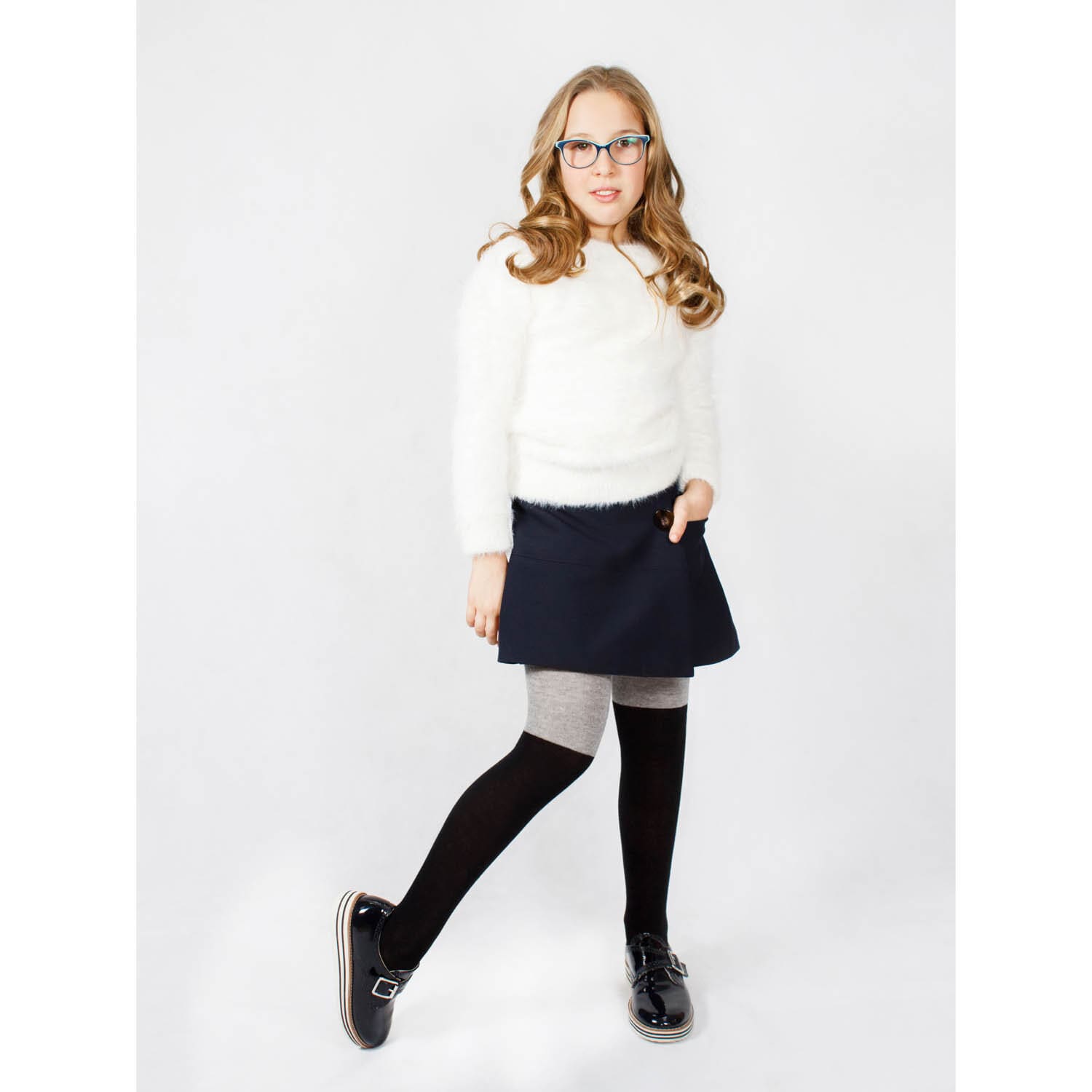 Мягкие, хлопковые колготки для девочки, однотонные, двуцветные. До колена имитация черных чулков, после колена серые однотонные колготки. Состав: хлопок 80%, полиамид 15%, эластан 5%.