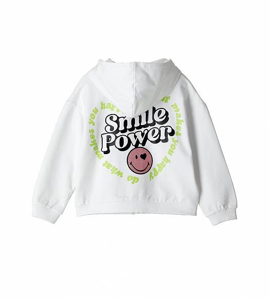 Белая толстовка на молнии с принтом спереди и на спине.