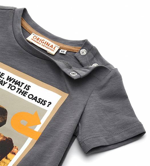 Футболка с короткими рукавами из плотного хлопка, застегивающаяся на кнопки на плече, принт спереди и этикетка снизу.