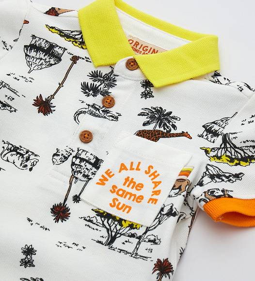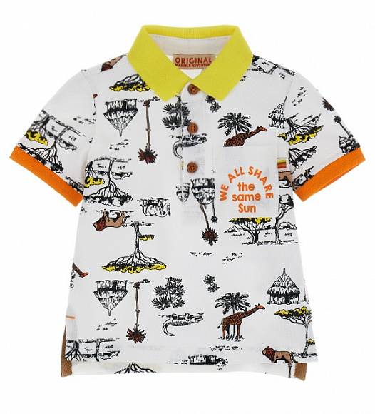 Рубашка-поло из пике с короткими рукавами, принтом по всей поверхности, воротником и окантовкой в рубчик контрастного цвета, боковым карманом, боковыми разрезами и этикеткой сбоку.