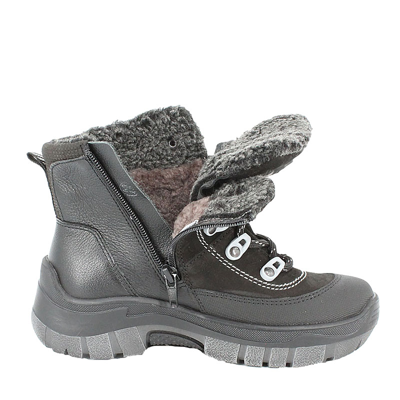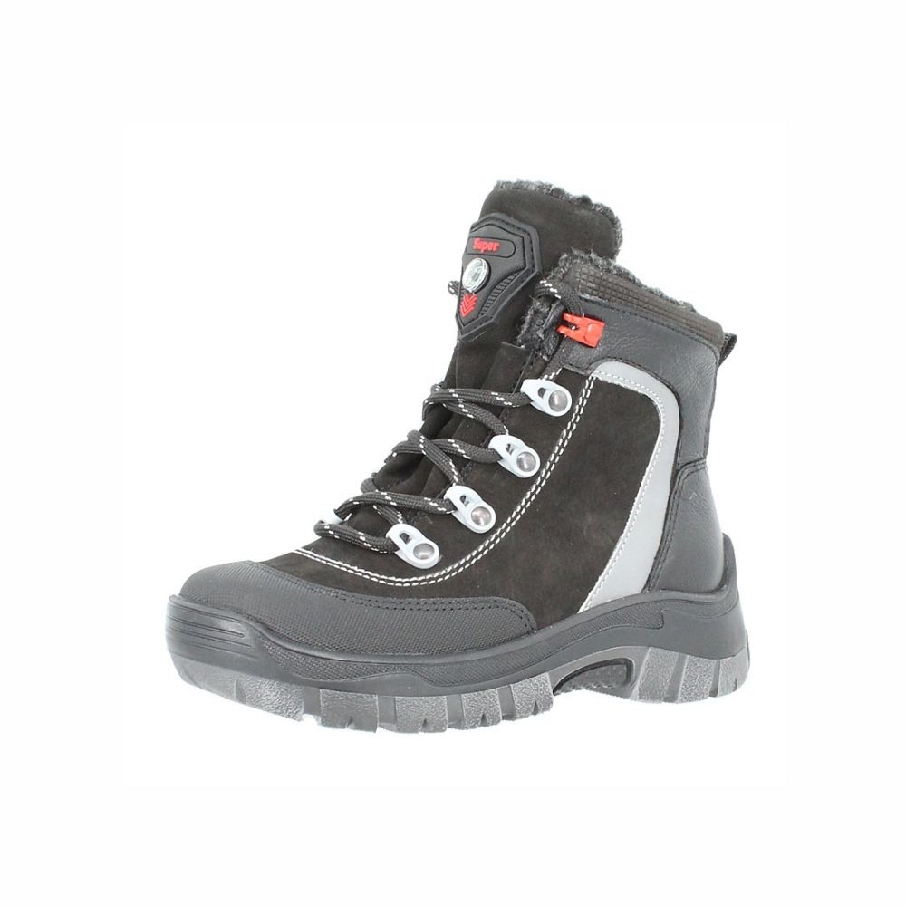 Зимние ботинки из натуральной кожи. Утеплитель натуральный мех. Подошва из материала ТЭП (термоэластопласт), не промерзает, не скользит. Носочная часть защищена антивандальным покрытием. Высокая шнуровка и молния позволяют надежно зафиксировать ногу. Язык-глухой клапан, препятствует попаданию снега внутрь.