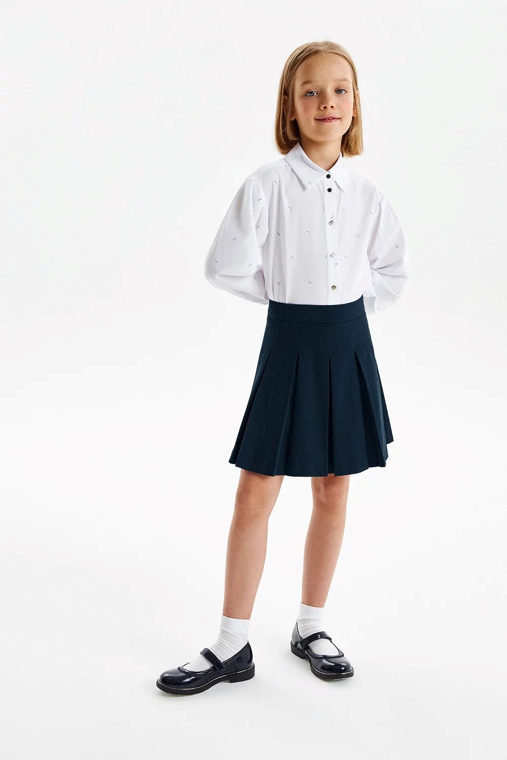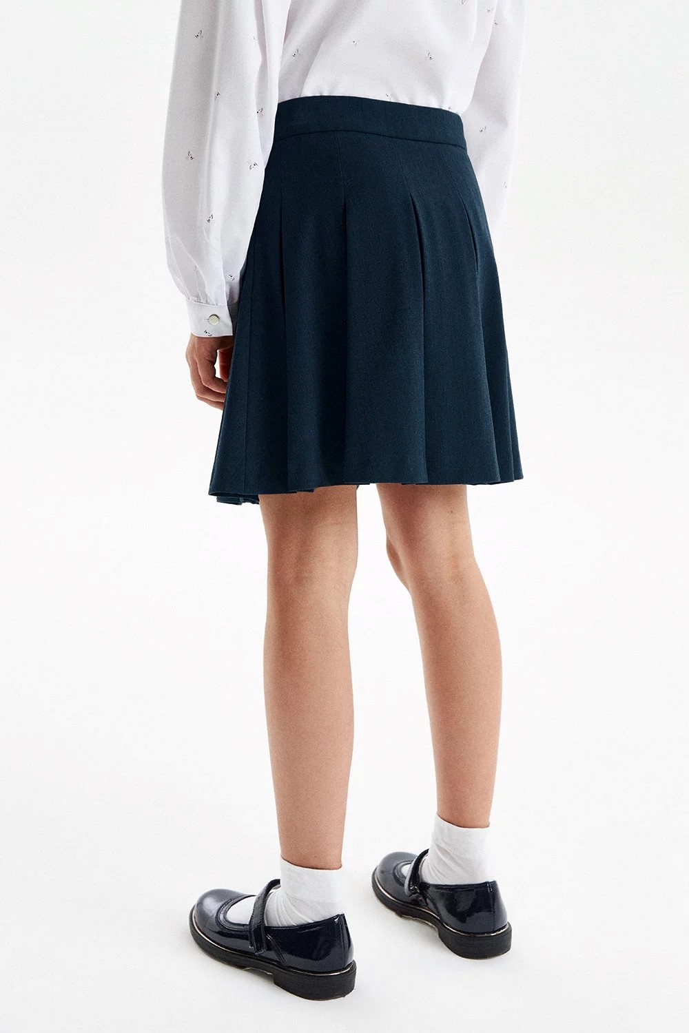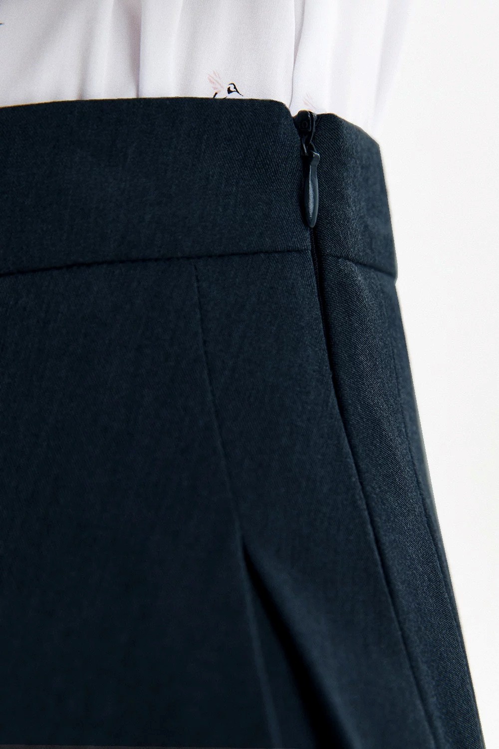 Синяя юбка из премиальной костюмной ткани. Юбка украшена широкими бантовыми складками. Сбоку аккуратная застёжка на потайную молнию.