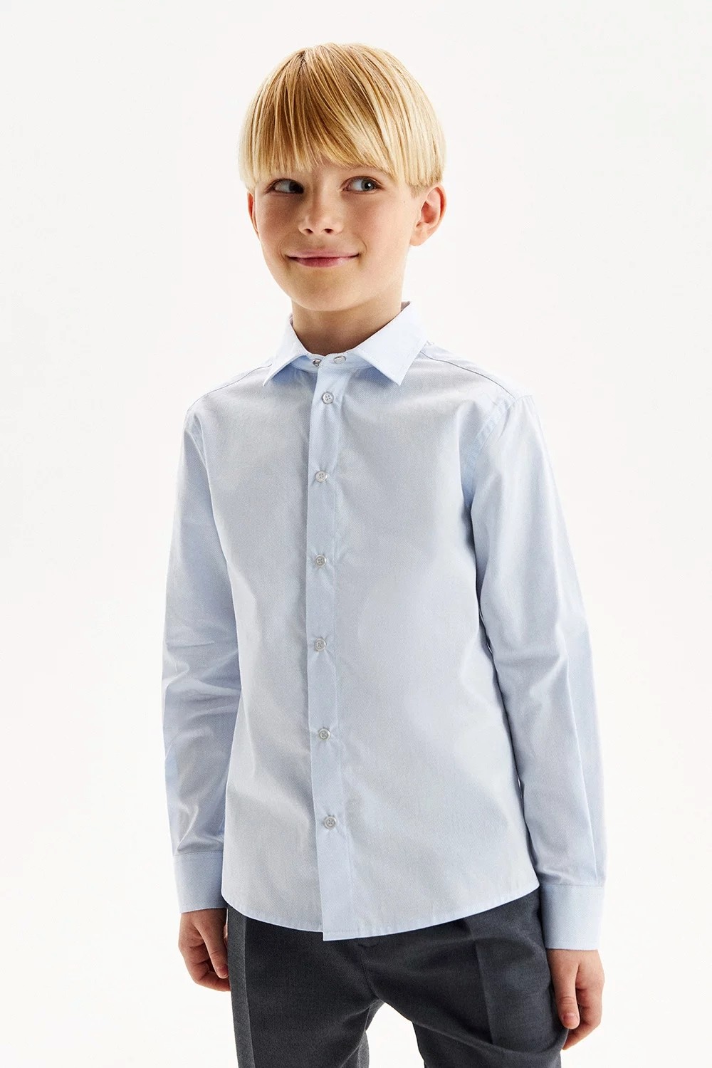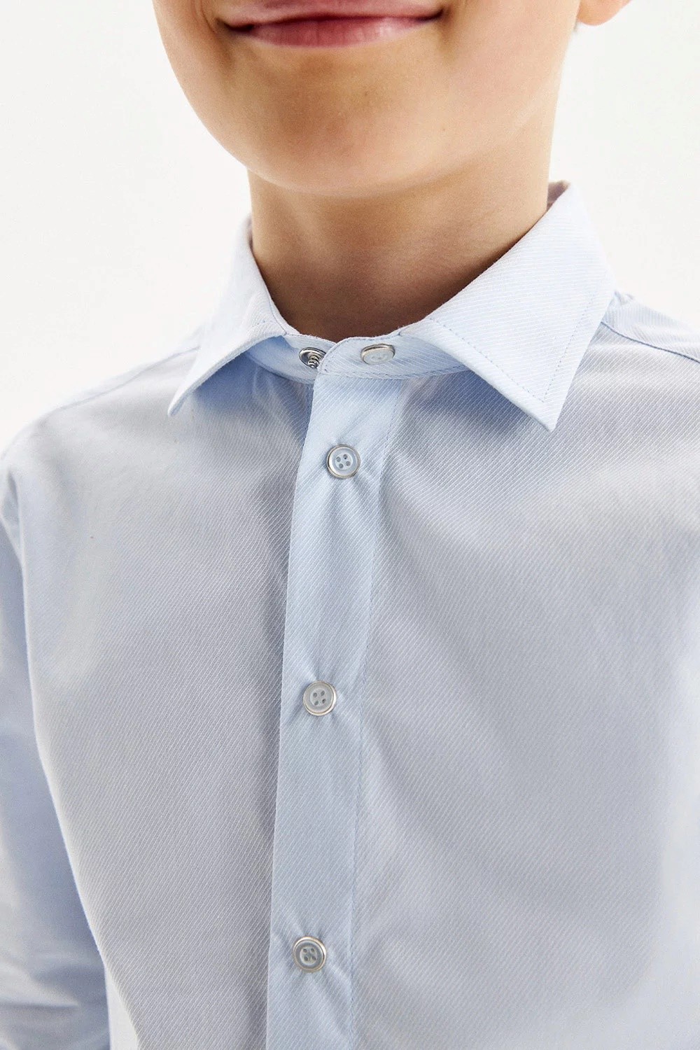 Голубая сорочка из 100% натурального фактурного хлопка. Силуэт Slim. Сорочка и манжеты застегиваются на кнопки.