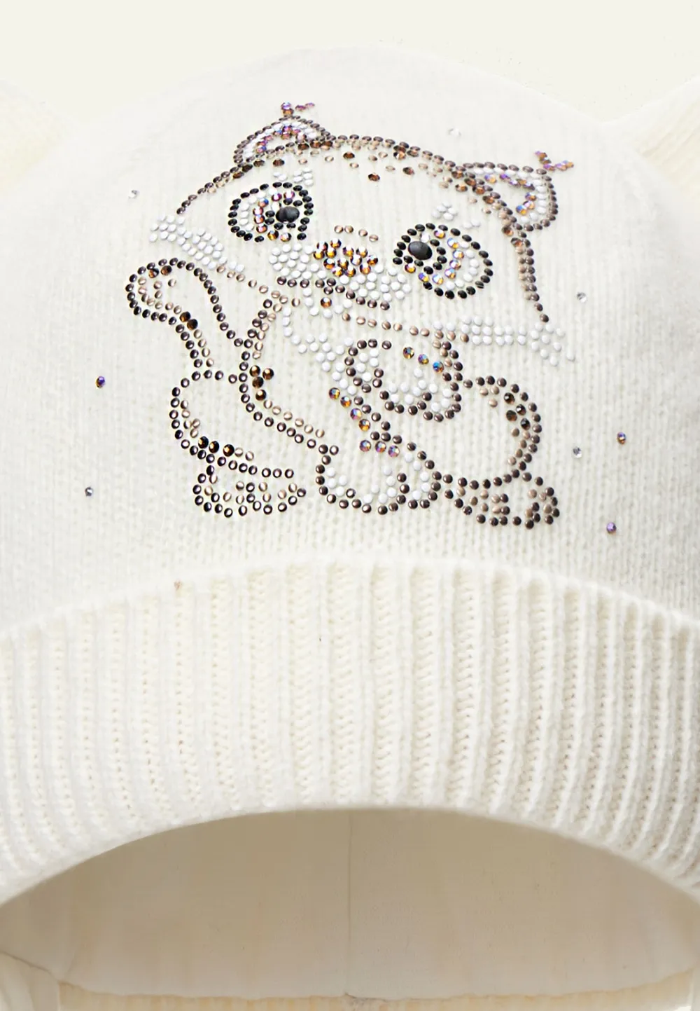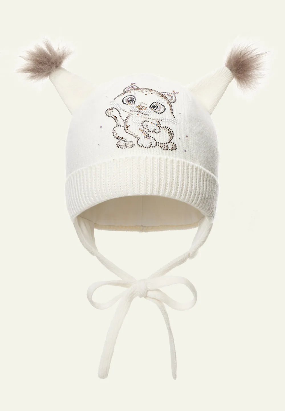 Теплая зимняя шапка на завязках, с ушками, декорирована стразами и мехом на ушках. Рекомендуется носить при температуре до -20 С.