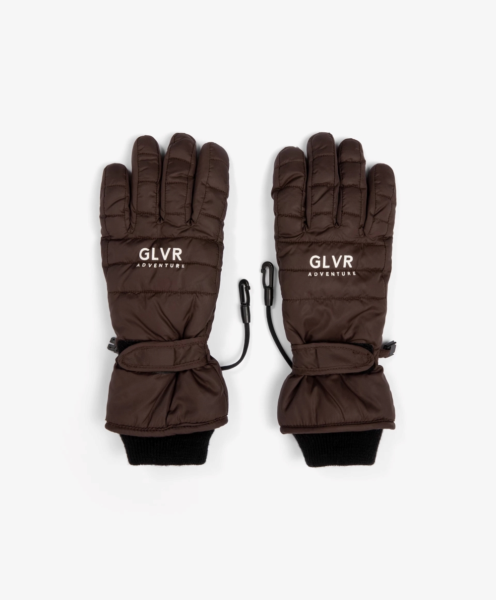 Перчатки из влагостойкой плащовки на подкладке способствуют продолжительной зимней прогулке. Специальный протектор на ладонной части усиливает износостойкость изделия. Перчатки имеют паты на липучках, фиксирующие зону запястья, трикотажные манжеты, препятствующие попаданию снега внутрь. Эластичная тесьма с карабинами позволяет прикрепить перчатки к куртке или пальто, предотвратив утерю. В оформлении модели используется лаконичный шрифтовой принт.
