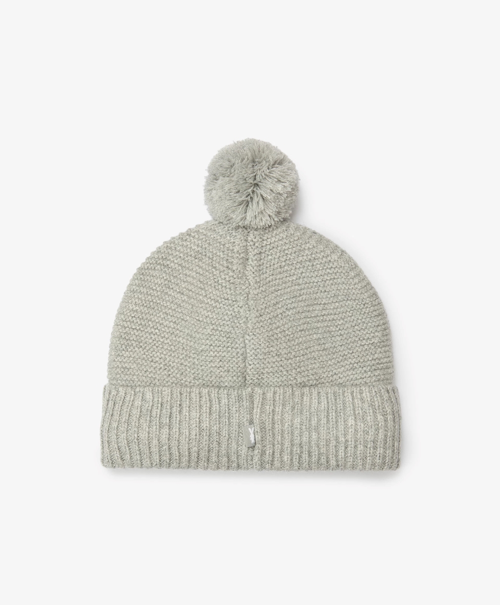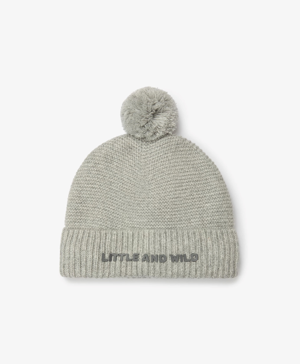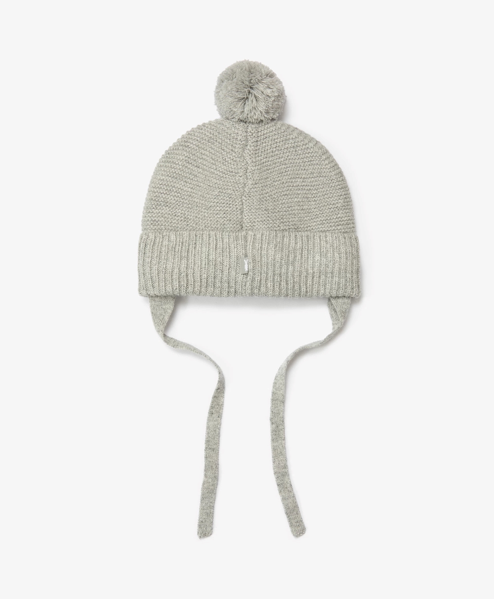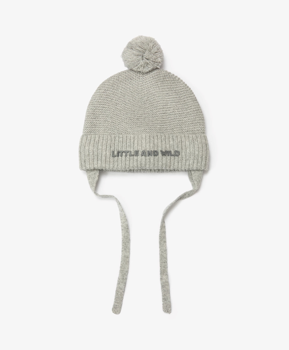 Серая вязаная шапка с помпоном — незаменимый аксессуар для осенне-зимних прогулок. Шапка на хлопковой подкладке выполнена из смесовой меланжевой пряжи с высоким содержанием шерсти мериноса и ангорской шерсти, придающей ей особую мягкость, нежность, уют. Функциональные завязки позволяют надежно зафиксировать шапку на голове ребенка. В оформлении модели использована стильная  шрифтовая нашивка.