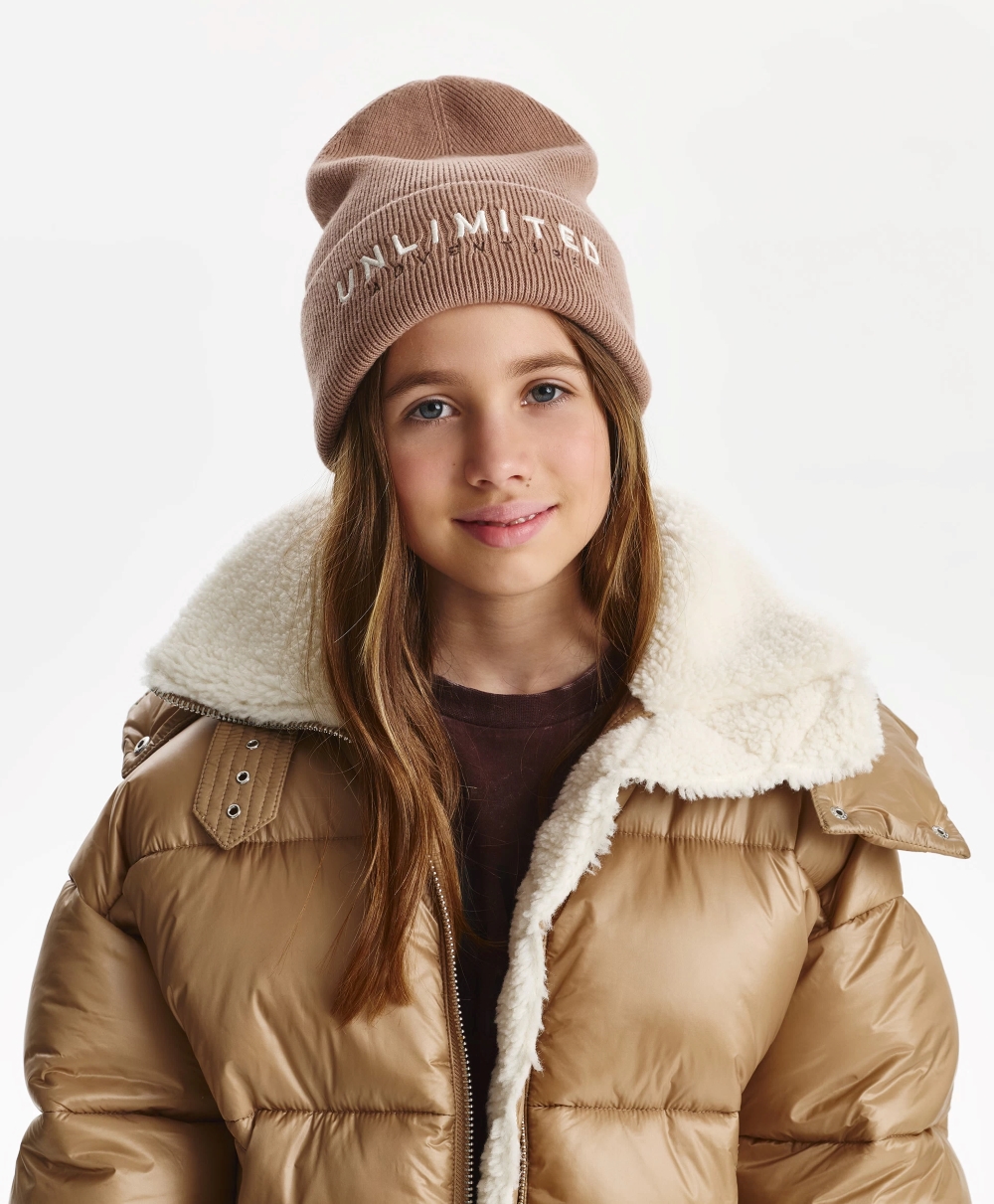 Двойная вязаная шапка с высоким отворотом создана для комфортных зимних прогулок девочки. Выполненная из мягкой и теплой пряжи с содержанием натуральной шерсти, шапка очень приятна при тактильном контакте. В оформлении модели использованы лаконичные шрифтовые элементы.