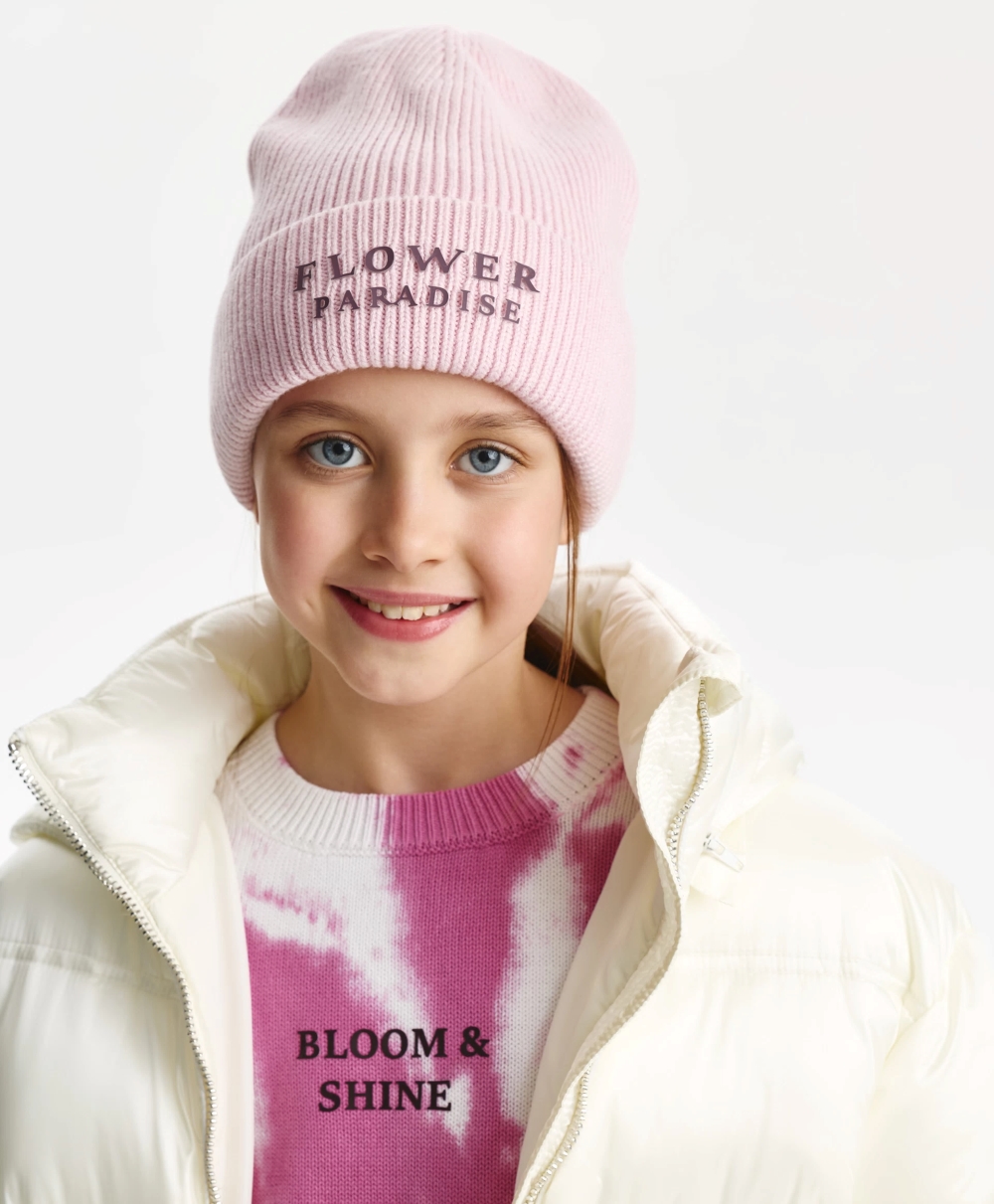 Вязаная шапка на флисе — обязательный атрибут уютных зимних образов девочки. Выполненная из мягкой и теплой смесовой пряжи с содержанием натуральной шерсти, шапка очень приятна при тактильном контакте. В оформлении модели использованы лаконичные шрифтовые элементы.