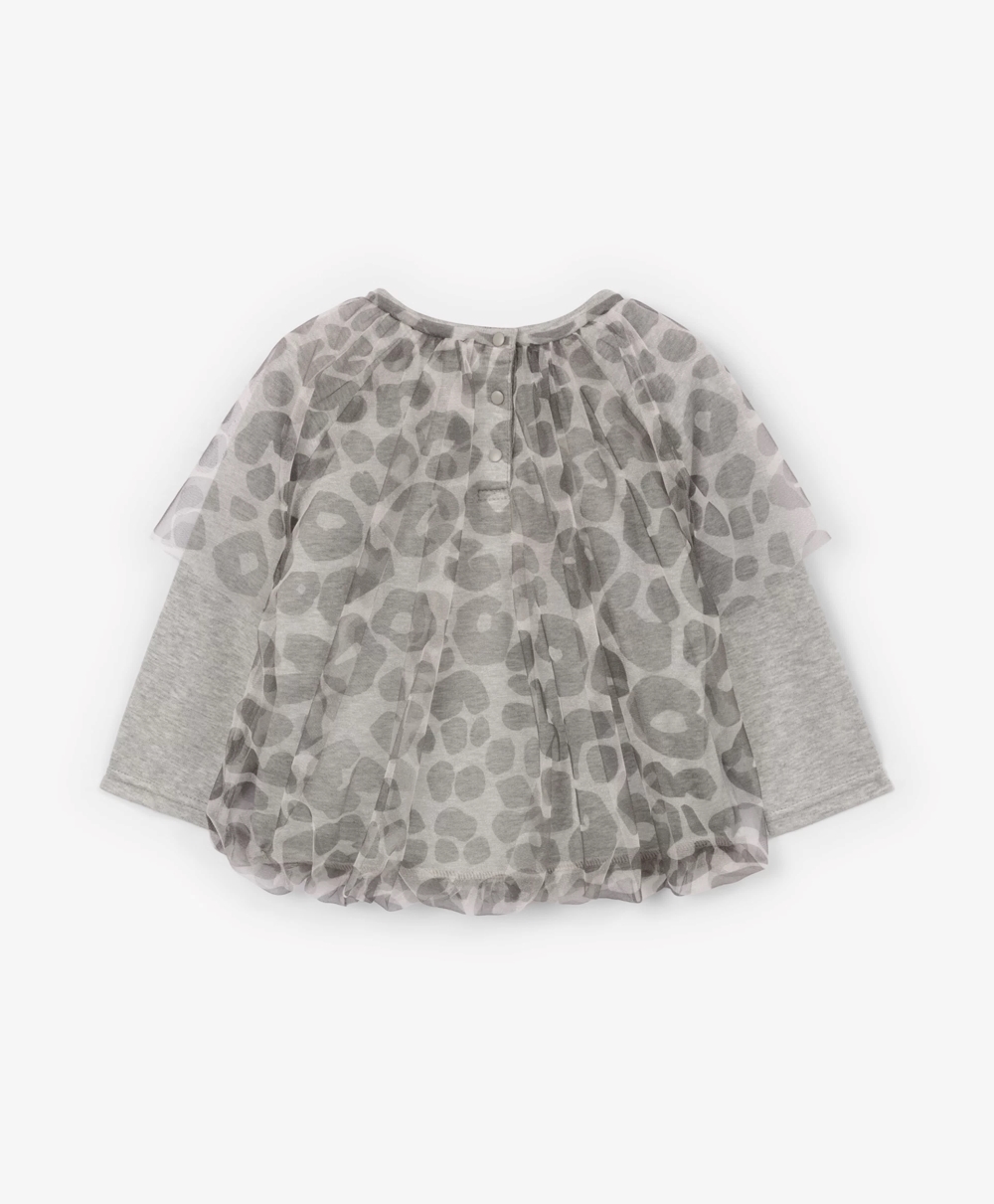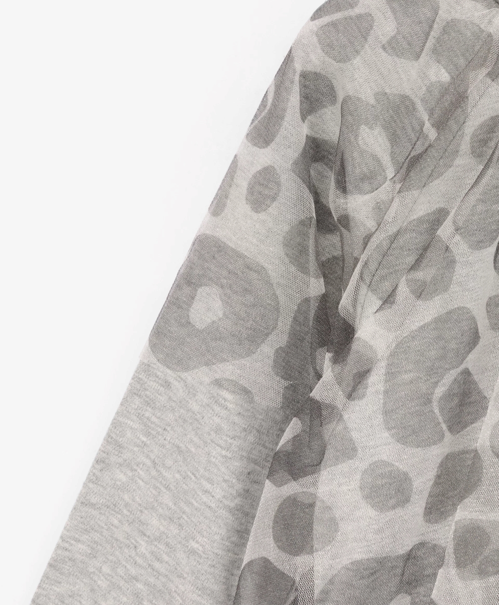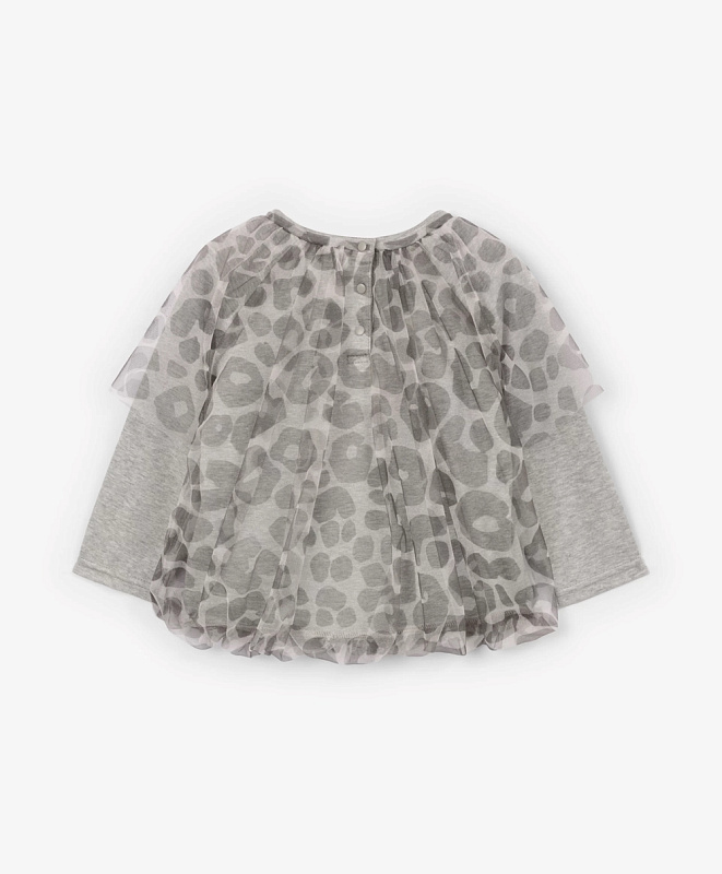 Стильная трикотажная блузка с имитацией многослойности - прекрасный повод отправиться в гости, сформировав нарядный комплект! Дизайн модели построен на сочетании двух материалов: меланжевого хлопкового трикотажа, являющегося первым слоем, и тонкой воздушной сетки с леопардовым принтом, имеющей легкий серебристый блеск. Свободная футболка из сетки прикреплена к основному изделию только по горловине и низу. Легкая сборка в местах соединения двух изделий придает блузке трапециевидную баллонообразную форму, делает ее очень нежной, женственной, воздушной. Блузка имеет застежку на кнопки, расположенную на спинке.