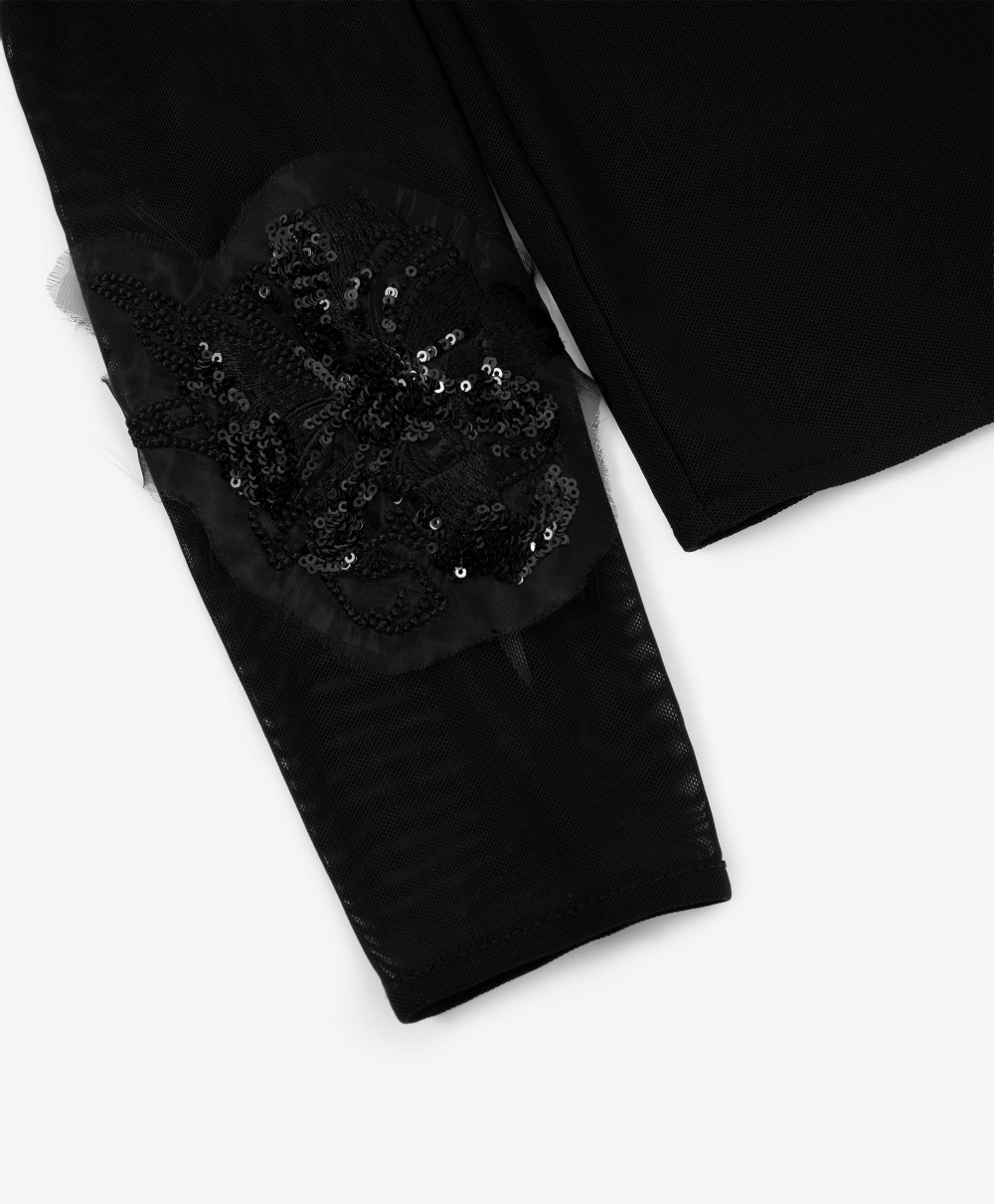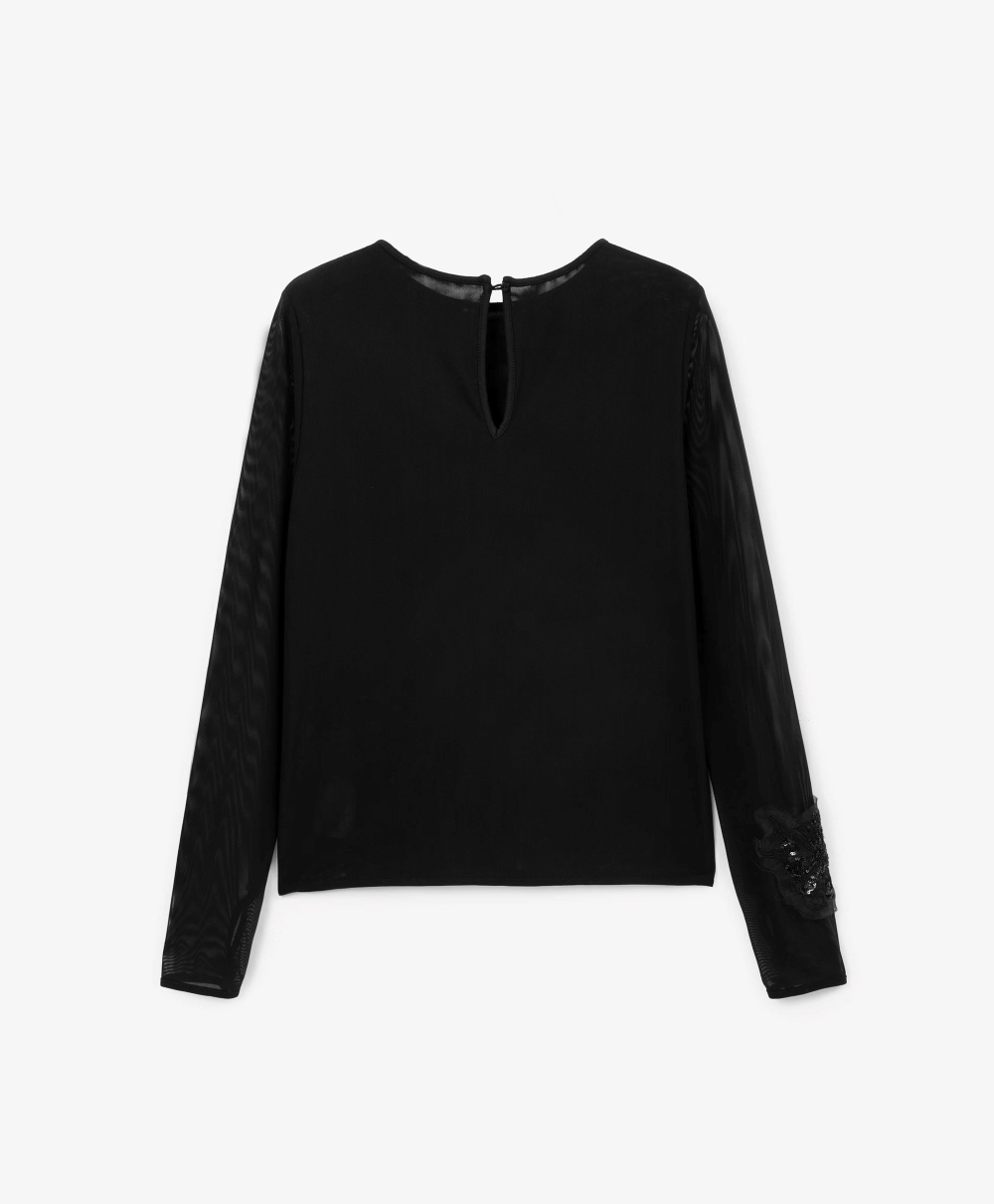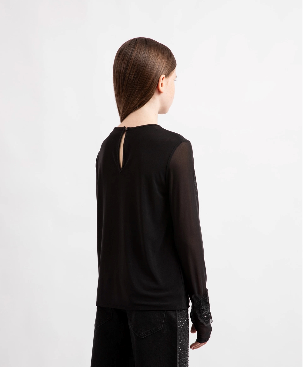 Черная блузка полуприлегающего силуэта с длинным рукавом - прекрасный вариант первого слоя в нарядных аутфитах. Блузка выполнена из трикотажной сетки с эластаном, очень мягкой и приятной тактильно. Удлиненные полупрозрачные рукава с отверстиями для больших пальцев, создающие тональный контраст с уплотненной майкой, позволяют красиво драпировать их в зоне запястья, придавая образу нотку легкой небрежности. Блузка имеет застежку-капельку на спинке.