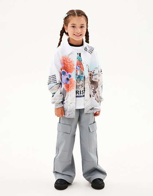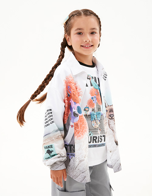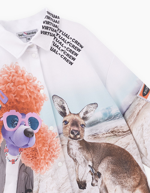 Авторский жакет-рубашка для девочки. Прямая модель. Спущенная линия плеча. Эластичные манжеты. Комфортная застёжка на кнопки. Рубашка декорирована дизайнерскими принтами и плёнкой с мерцающим эффектом.