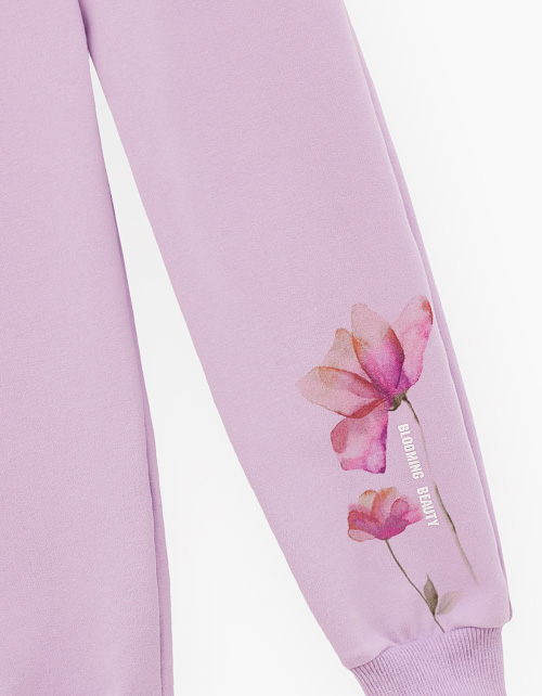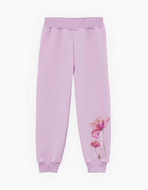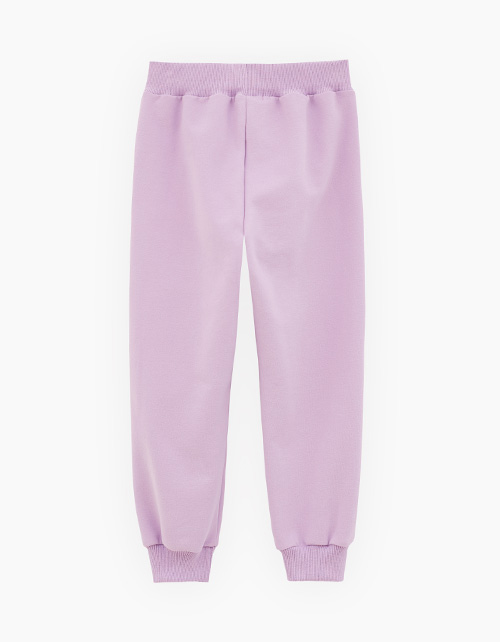 Комфортные брюки-джоггеры лилового оттенка для девочки. Изделие на мягком эластичном поясе, со средней посадкой. Мягкие манжеты из рибаны. Брюки из тактильно приятного футера. Авторский принт.