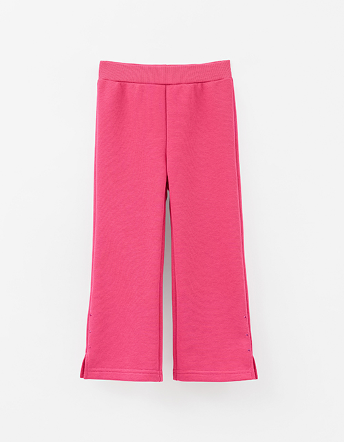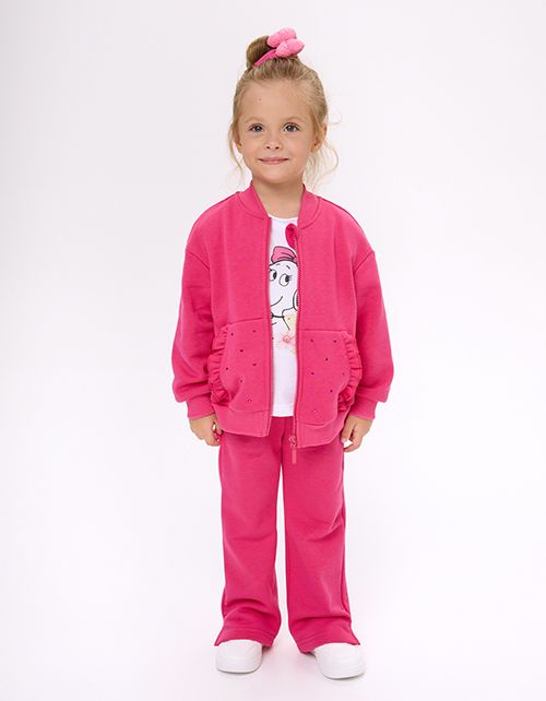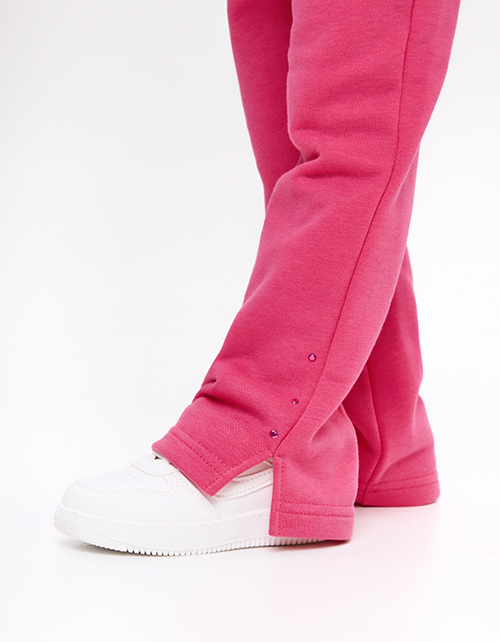 Брюки оттенка фуксия для девочки. Прямой силуэт и средняя посадка обеспечивают комфорт. Пояс из мягкой рибаны с внутренней эластичной лентой надёжно фиксирует посадку. По низу - небольшие разрезы. Акцентный декор стразами.