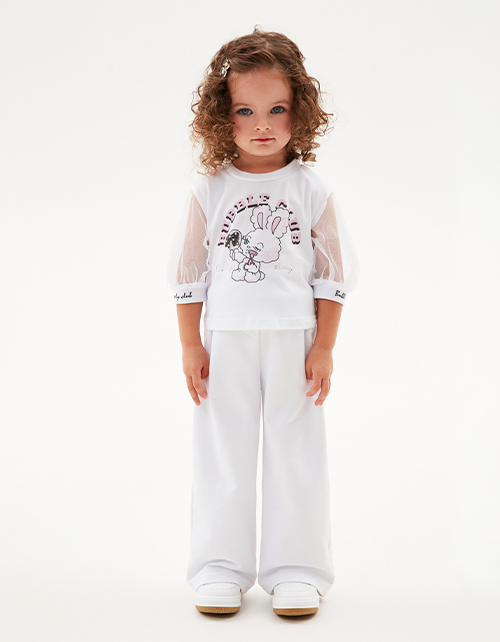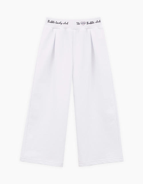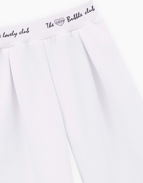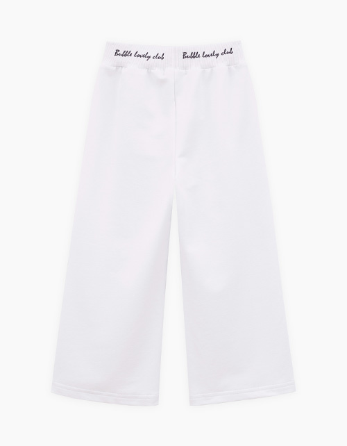 Белые широкие брюки для девочки. Прямая модель, со средней посадкой, на мягком эластичном поясе. Брюки декорированы авторским лаконичным принтом. Идеальная база для стильных образов.
