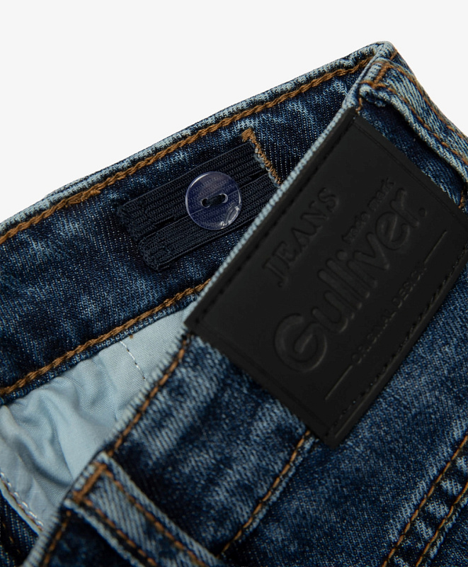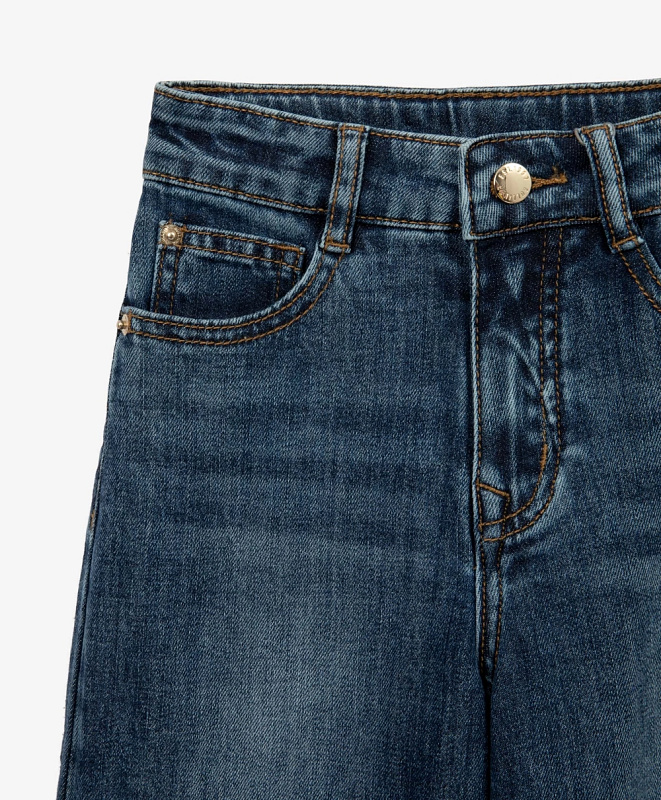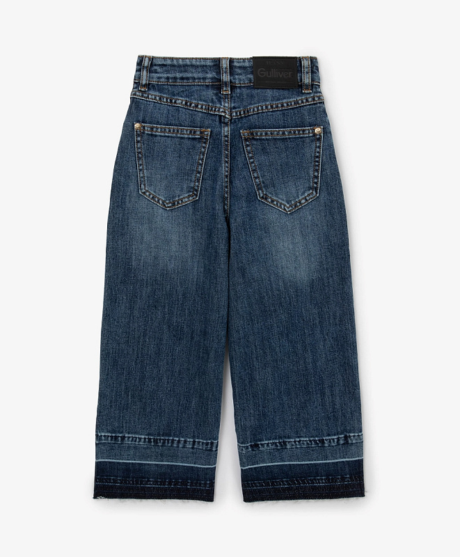 Синие джинсы силуэта палаццо станут фаворитами в осеннем гардеробе девочки! Открытые срезы по нижнему краю, образующие модную бахрому, потертости и варка придают джинсам остроту и современность стритстайла. Джинсы  выполнены из мягкого денима с эластаном, способствующем комфортной посадке и свободе движений девочки. Джинсы имеют пять стандартных карманов, застегиваются на молнию и крючок. В оформлении модели использована стильная резиновая нашивка с шрифтовыми элементами, расположенная на задней части пояса.
