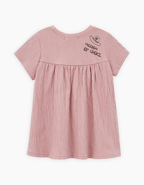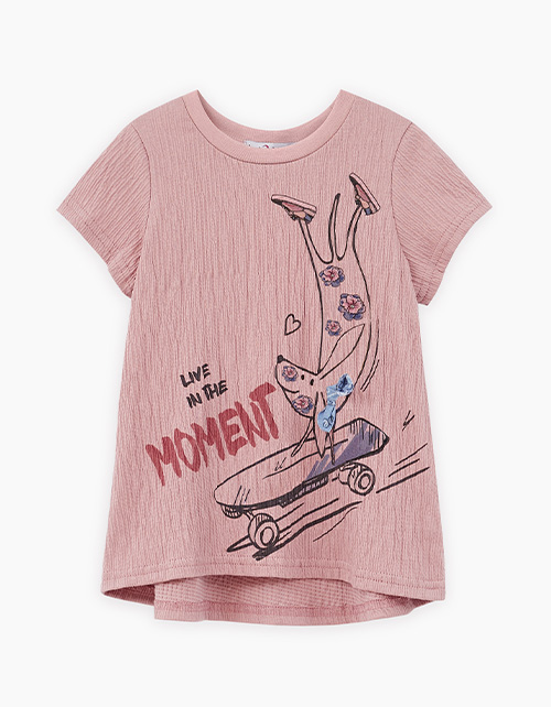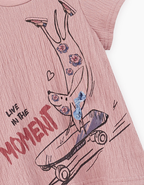 Дизайнерская туника для девочки. Модель трапециевидного силуэта. Изделие из материала с эффектом "жатости", что придаёт оригинальный внешний вид и не требует глажки. Футболка с авторским принтом декорирована отлетным элементом и стразами.