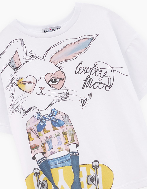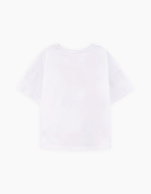 Дизайнерская белая футболка для девочки. Прямая объёмная модель. Спущенная линия плеча. Эластичная горловина. Футболка с авторским принтом декорирована стразами.